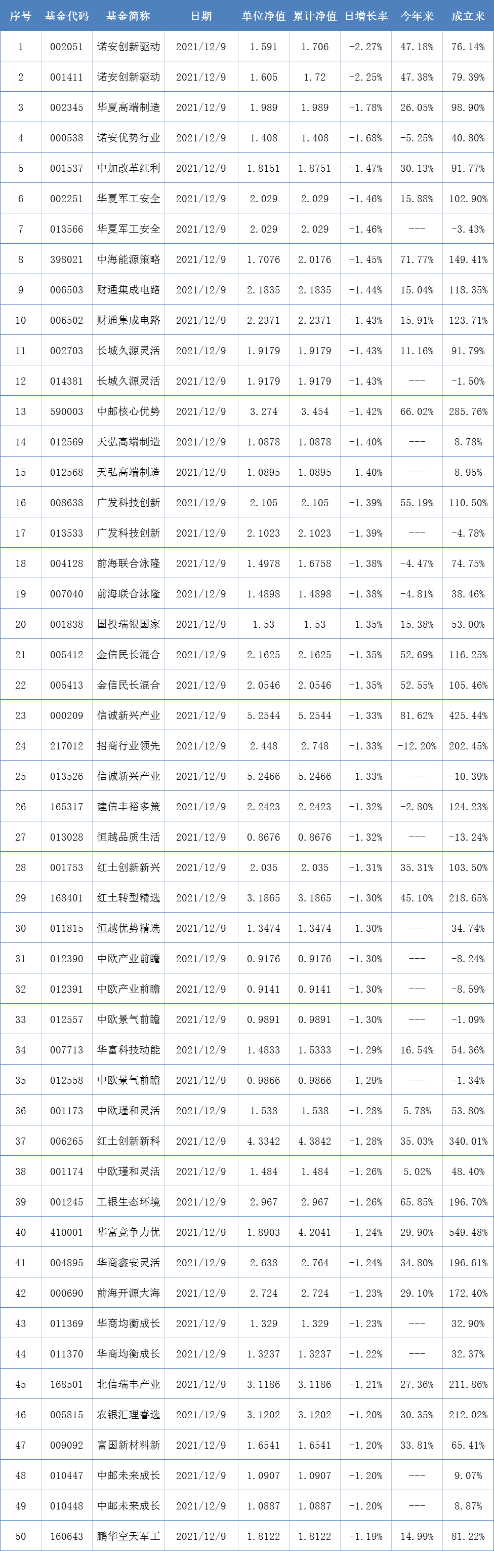 以下为12月9日两市表现最差的50只基金: