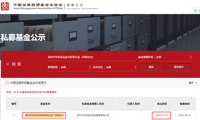 深圳市华拓至远叁号投资企业(有限合伙)成立时间为2016年4月18日,但中国证券投资基金业协会披露的成立时间为2020年3月23日,相差近4年时间。