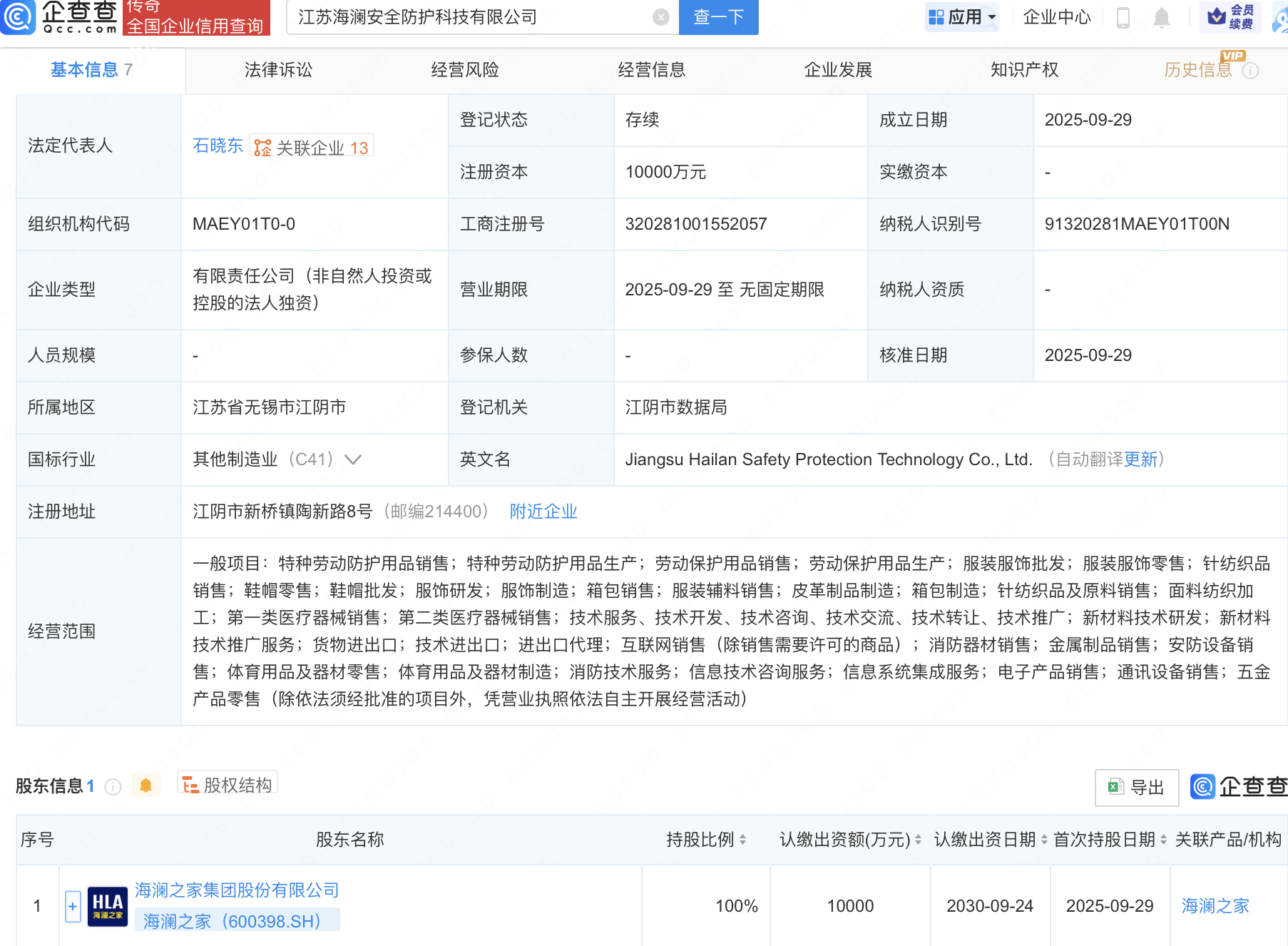 企查查APP显示,近日,江苏海澜安全防护科技有限公司成立,注册资本1亿元,经营范围包含:新材料技术研发;新材料技术推广服务;货物进出口;技术进出口等。企查查股权穿透显示,该公司由海澜之家(600398)全资持股。