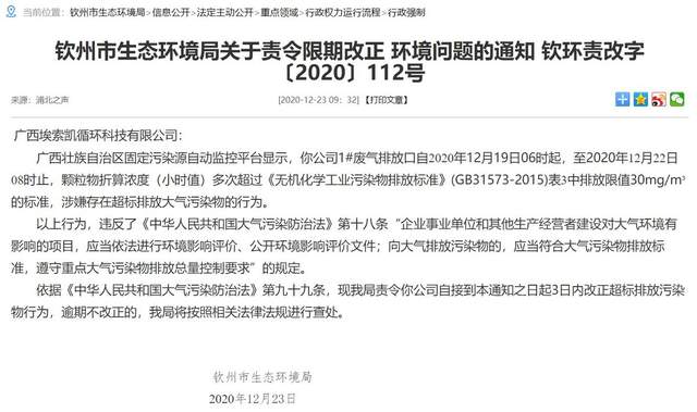 2020年12月23日钦州市生态环境局官网发布的信息显示,经广西壮族自治区固定污染源自动监控平台监测,2020年12月19日06时起至2020年12月22日08时止,循环科技废气排放口排放的颗粒物折算浓度(小时值)多次超过限值标准,涉嫌存在超标排放大气污染物的行为,钦州市生态环境局责令循环科技改正超标排放污染物的行为。