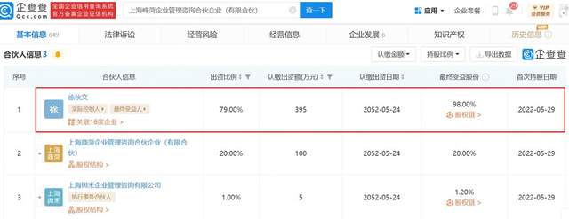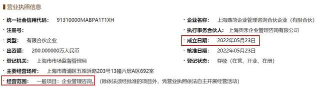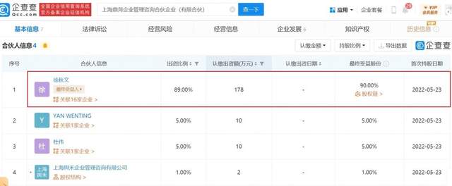企信网信息显示,上海鼎菏、上海峰菏分别成立于2022年5月23日、5月29日,经营范围均为企业管理咨询。企查查网站显示,徐秋文认缴了上海鼎菏178万元的出资额,出资比例89%,首次持股日期为2022年5月23日;认缴了上海峰菏395万元的出资额,出资比例79%,首次持股日期为2022年5月29日。