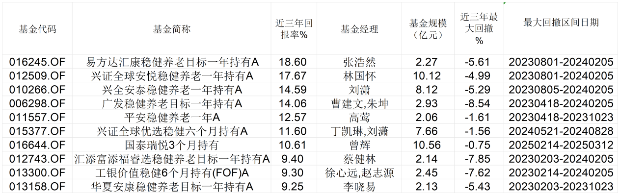 表:截至三季度末,近三年来回报率靠前、回撤率较小的10只FOF明细 来源:Wind数据 界面新闻整理