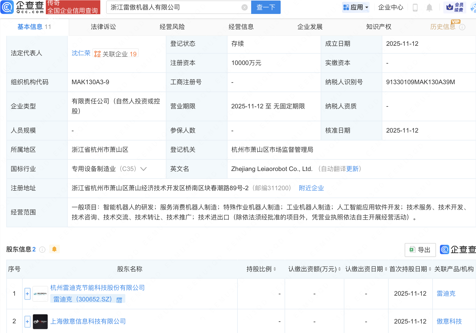 企查查APP显示,近日,浙江雷傲机器人有限公司成立,注册资本1亿元,经营范围包含:智能机器人的研发;服务消费机器人制造;特殊作业机器人制造;工业机器人制造;人工智能应用软件开发等。企查查股权穿透显示,该公司由雷迪克(300652)等共同持股。