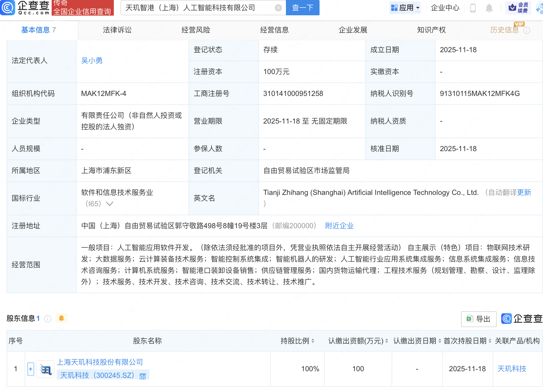 企查查APP显示,近日,天玑智港(上海)人工智能科技有限公司成立,经营范围包含:智能机器人的研发;人工智能行业应用系统集成服务;信息系统集成服务;信息技术咨询服务等。企查查股权穿透显示,该公司由天玑科技(300245)全资持股。