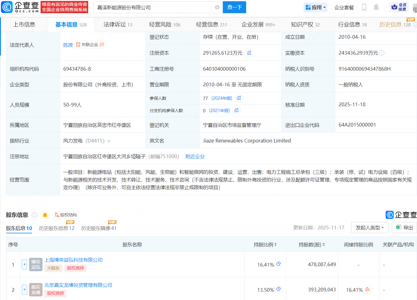 企查查APP显示,近日,嘉泽新能(601619)发生工商变更,注册资本由约24.3亿元增至约29.1亿元,同时多位高管发生变更。企查查信息显示,该公司成立于2010年4月,法定代表人陈波,经营范围包含新能源电站和智能微网的投资、建设、运营、出售等,由上海博荣益弘科技有限公司、北京嘉实龙博投资管理有限公司等共同持股。