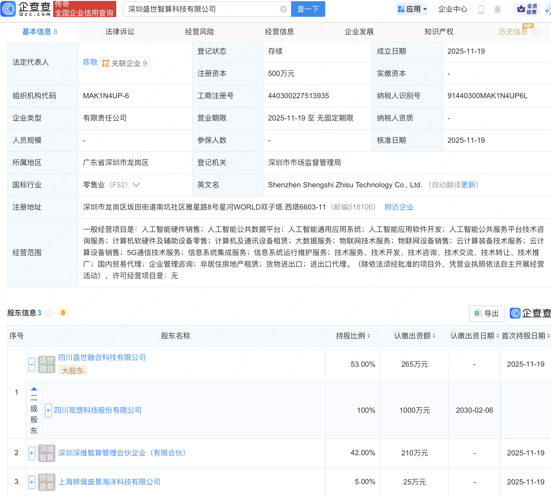 企查查APP显示,近日,深圳盛世智算科技有限公司成立,经营范围包含:人工智能硬件销售;人工智能公共数据平台;人工智能通用应用系统;人工智能应用软件开发等。企查查股权穿透显示,该公司由观想科技(301213)全资子公司四川盛世融合科技有限公司等共同持股。