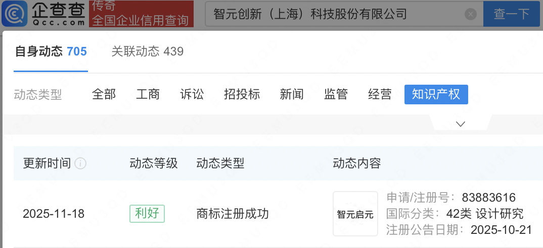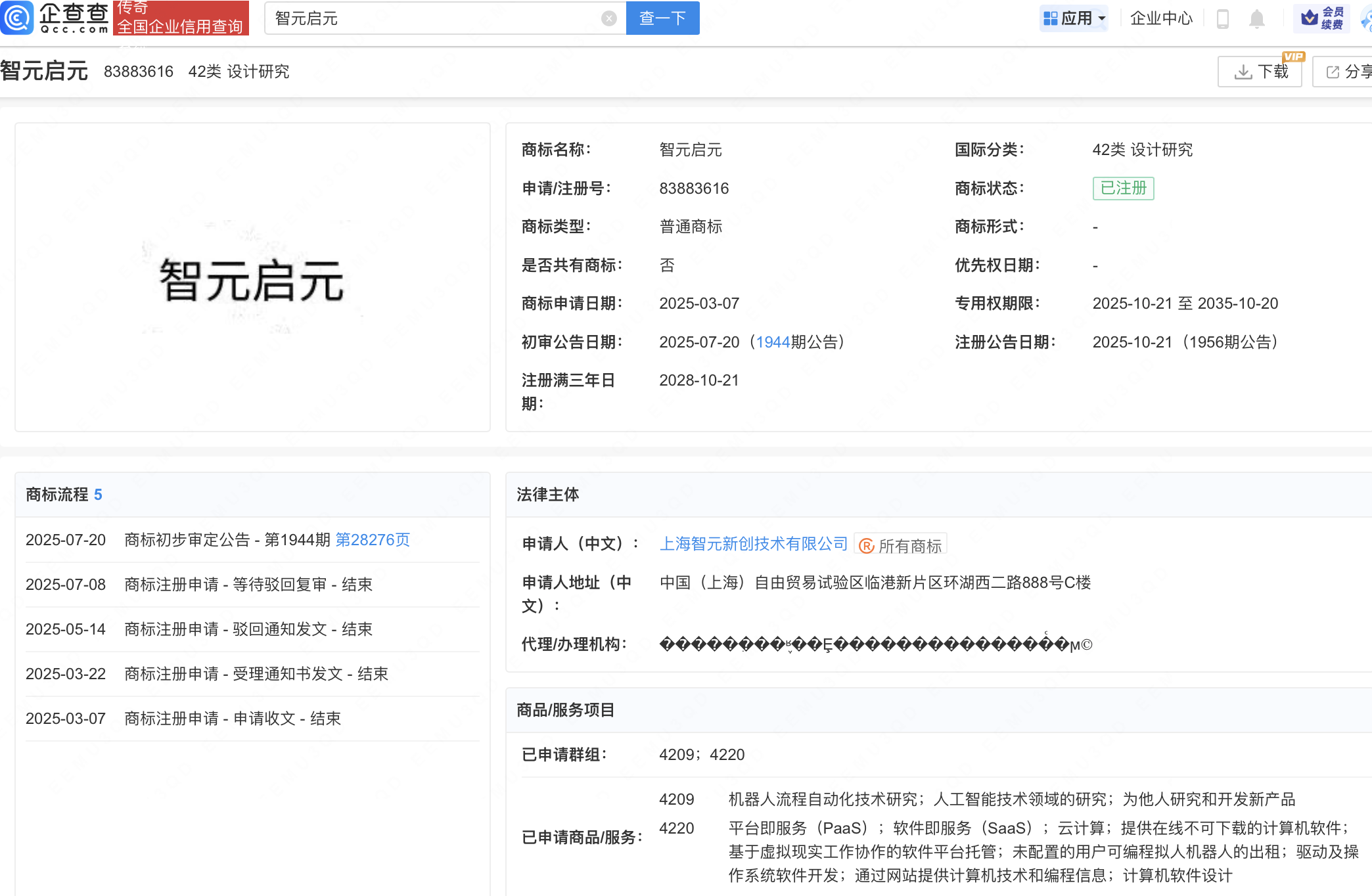 企查查APP显示,近日,智元机器人关联公司智元创新(上海)科技股份有限公司注册成功1枚“智元启元”商标,国际分类为设计研究,已申请商品服务包含机器人流程自动化技术研究、人工智能技术领域的研究等。公开信息显示,智元启元是智元机器人发布的首个通用具身基座模型。