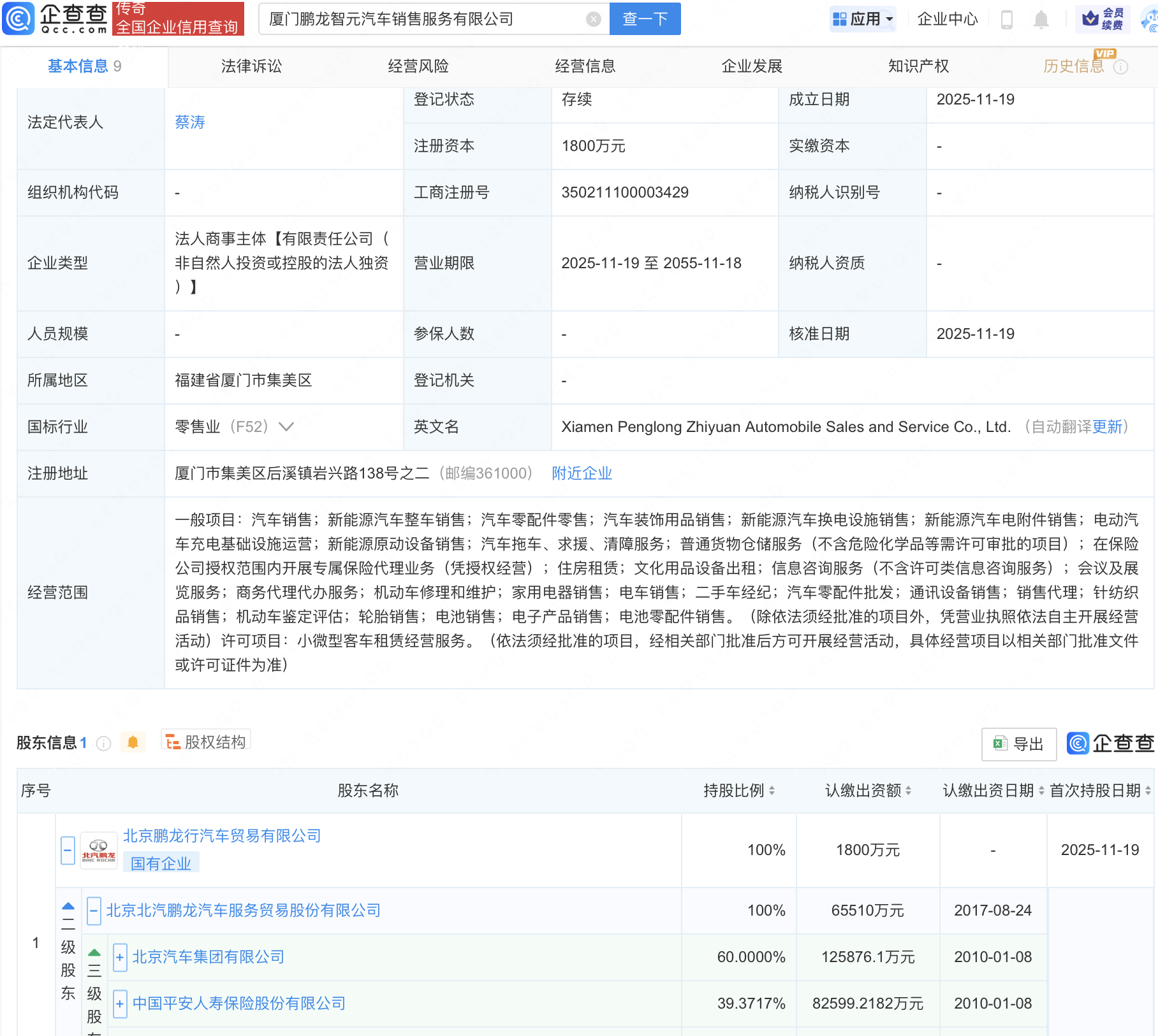 企查查APP显示,近日,厦门鹏龙智元汽车销售服务有限公司成立,注册资本1800万元,经营范围包含:汽车零配件零售;汽车装饰用品销售;新能源汽车换电设施销售;新能源汽车电附件销售等。企查查股权穿透显示,该公司由北京汽车集团有限公司旗下北京鹏龙行汽车贸易有限公司全资持股。
