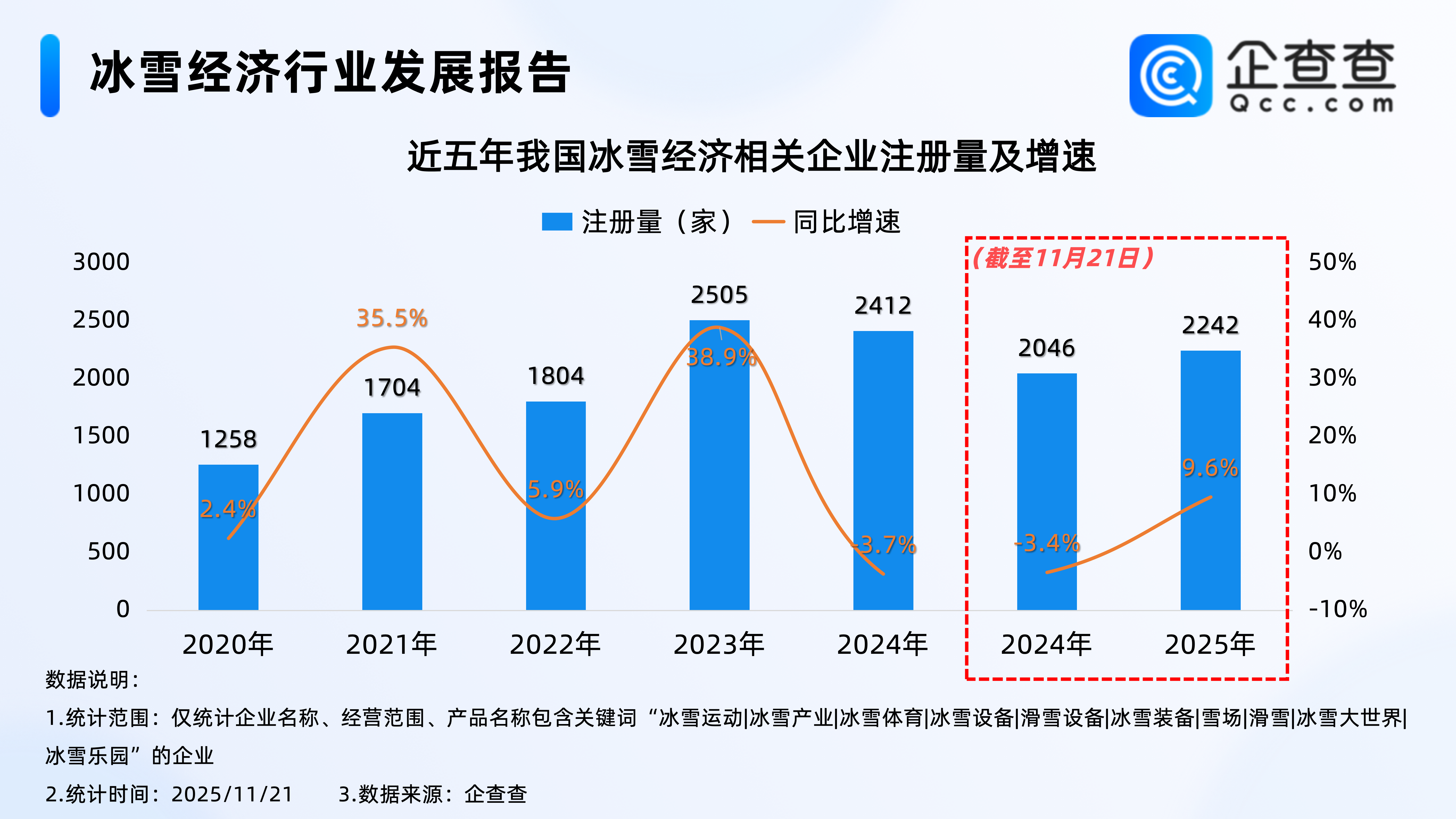 企查查数据显示,2020年以来,我国冰雪经济相关企业注册量整体稳步增加,2023年我国累计注册2505家冰雪经济相关企业,达近五年注册量峰值;截至11月21日,2025年我国已注册2242家冰雪经济相关企业,相比2024年同期增加9.6%。
