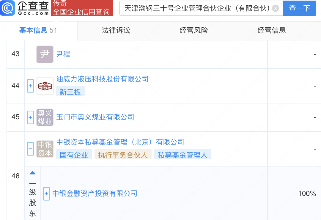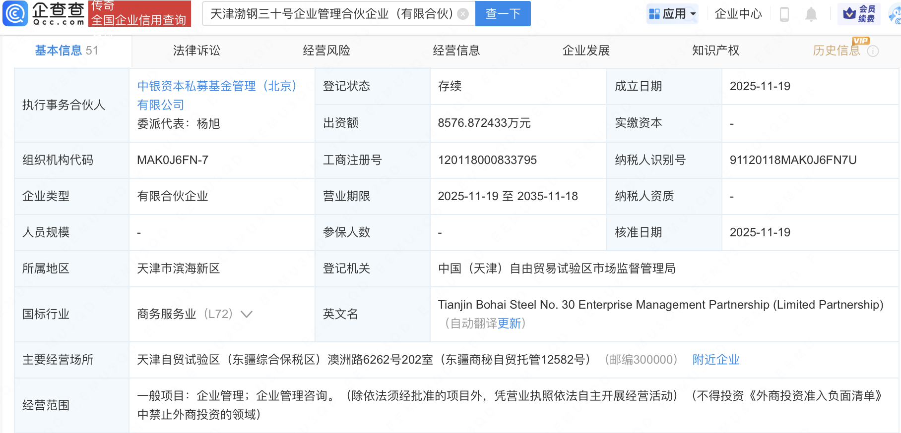 企查查APP显示,近日,天津渤钢三十号企业管理合伙企业(有限合伙)成立,经营范围包含:企业管理;企业管理咨询。企查查股权穿透显示,该企业由梦网科技(002123)、中银金融资产投资有限公司全资子公司中银资本私募基金管理(北京)有限公司等共同出资。