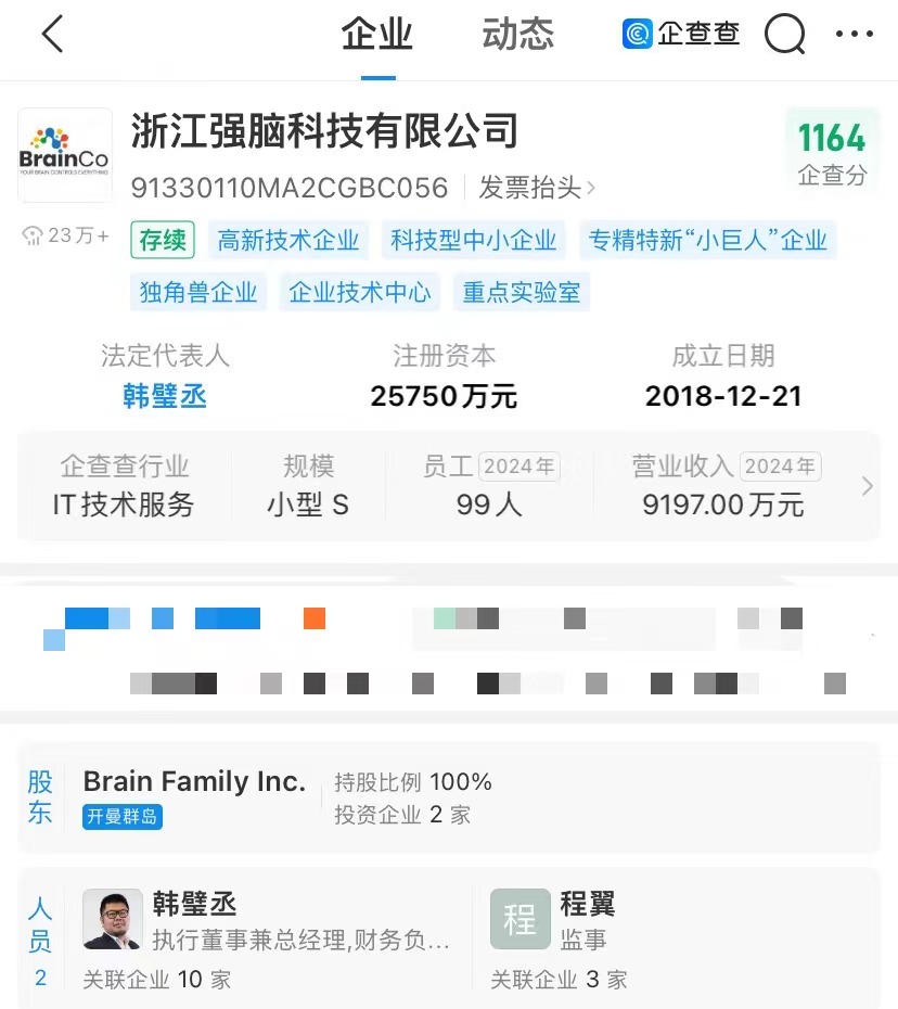 据了解,阿尔兹海默病又称老年痴呆症,据《中国阿尔茨海默病报告2025》,我国当前约有近1700万阿尔茨海默病及其他认知障碍患者。强脑科技为“杭州六小龙”之一,企查查显示,该公司成立于2018年12月21日,法定代表人为韩璧丞,注册资本约为2.58亿元,为非侵入式脑机接口技术解决方案供应商。