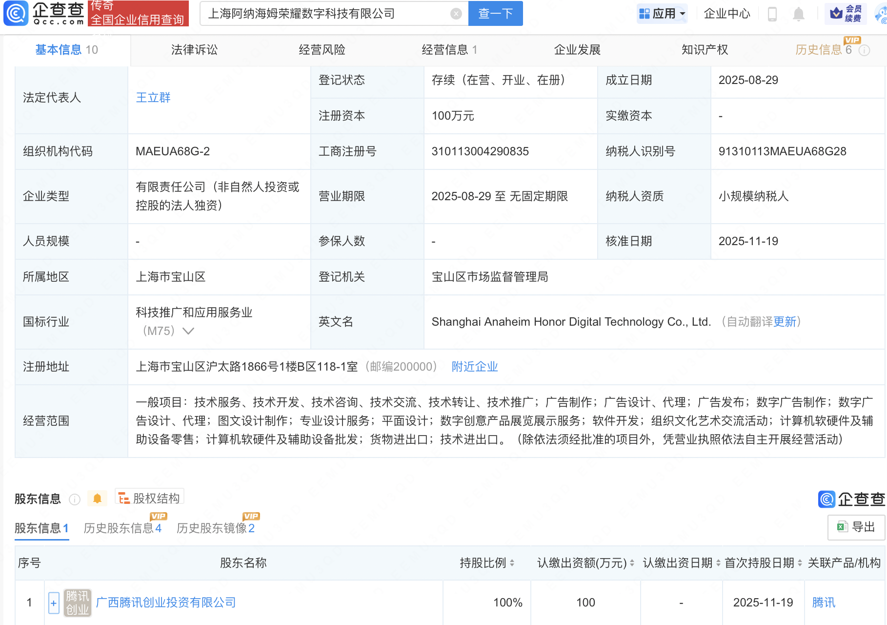 企查查APP显示,近日,上海阿纳海姆荣耀数字科技有限公司发生工商变更,原股东均退出,新增广西腾讯创业投资有限公司为全资股东。企查查信息显示,该公司成立于2025年8月,法定代表人为王立群,经营范围包含:数字创意产品展览展示服务;软件开发;组织文化艺术交流活动;计算机软硬件及辅助设备零售等。