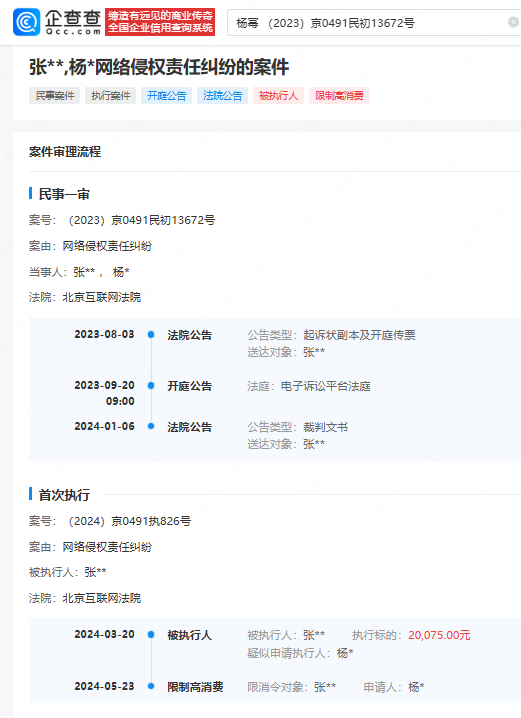 企查查APP显示,近日,杨幂起诉张某某网络侵权责任纠纷案件更新,张某某被恢复执行20075元。案件流程显示,该案于2023年开庭审理,张某某于2024年3月首次被执行,5月被采取限制高消费措施。