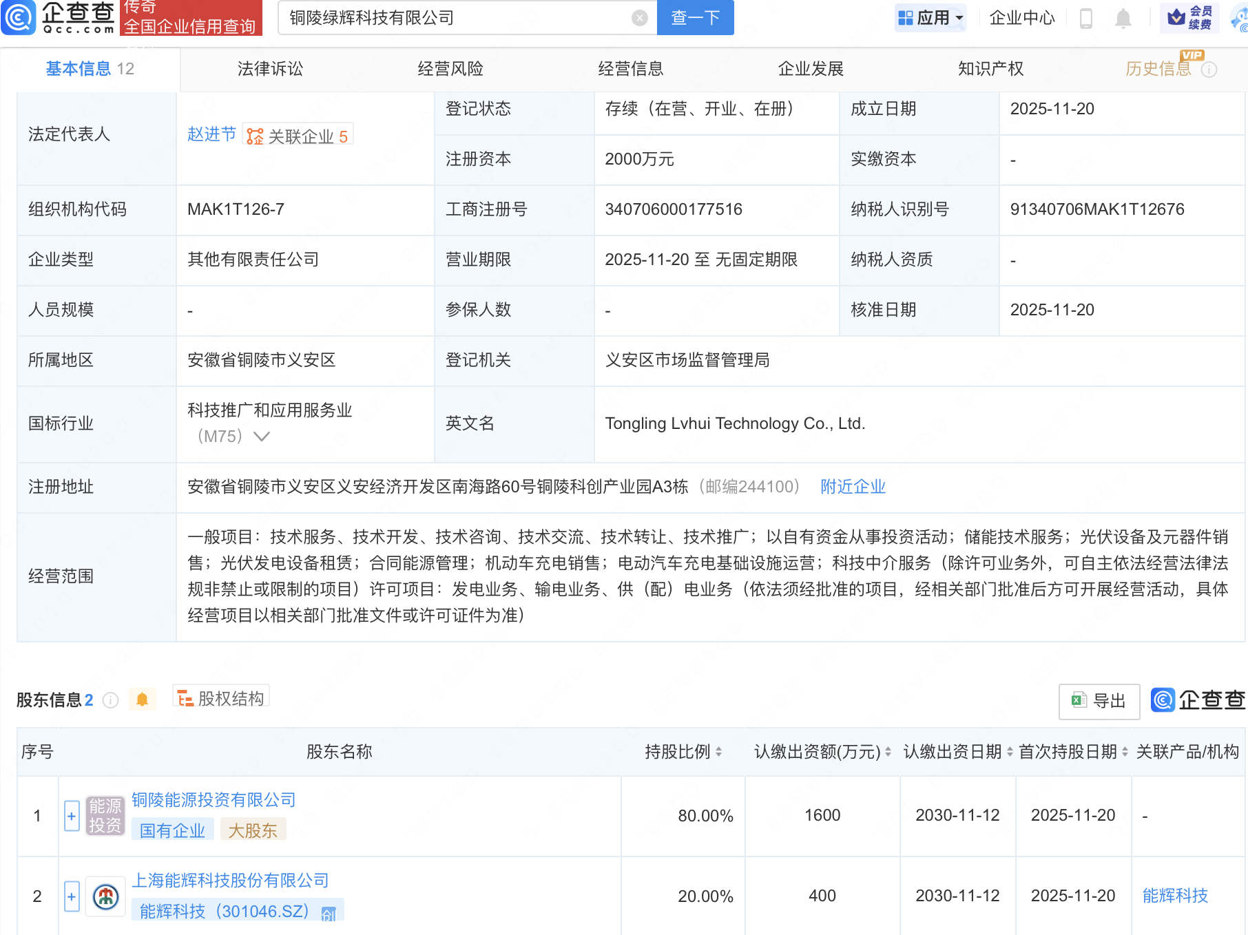 企查查APP显示,近日,铜陵绿辉科技有限公司成立,注册资本2000万元,经营范围包含:储能技术服务;光伏设备及元器件销售;光伏发电设备租赁;合同能源管理;机动车充电销售;电动汽车充电基础设施运营等。企查查股权穿透显示,该公司由能辉科技(301046)等共同持股。