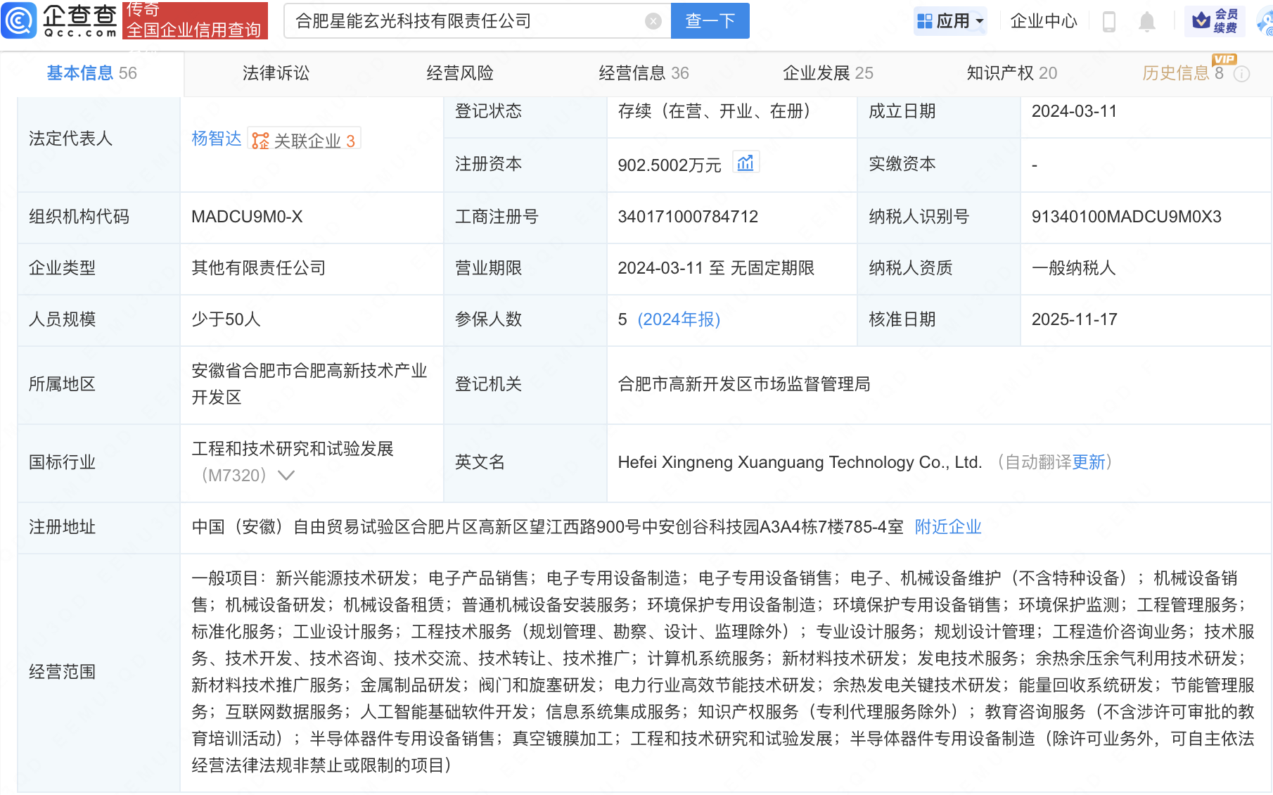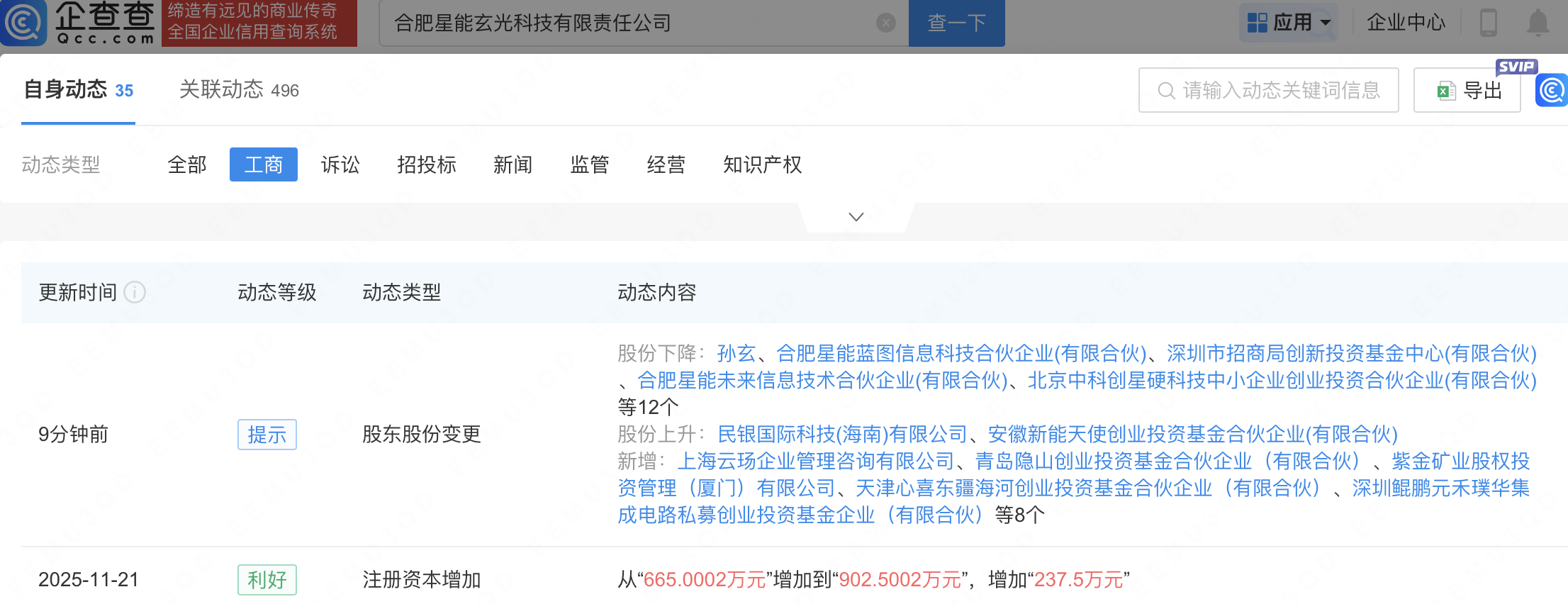 企查查APP显示,近日,合肥星能玄光科技有限责任公司发生工商变更,新增蚂蚁科技集团股份有限公司全资子公司上海云玚企业管理咨询有限公司、紫金矿业(601899)旗下紫金矿业股权投资管理(厦门)有限公司等为股东,同时注册资本增至902.5万元。企查查信息显示,该公司成立于2024年,经营范围包含:互联网数据服务;人工智能基础软件开发;半导体器件专用设备销售等。公开信息显示,星能玄光是一家专注于聚变能源领域的创新型企业。