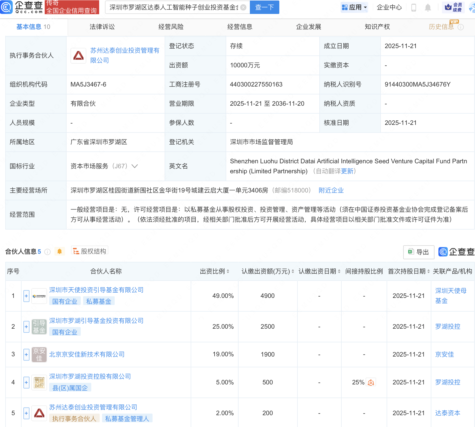 企查查APP显示,近日,深圳市罗湖区达泰人工智能种子创业投资基金合伙企业(有限合伙)成立,出资额1亿元,经营范围包含:以私募基金从事股权投资、投资管理、资产管理等活动。企查查股权穿透显示,该企业由深圳市天使投资引导基金有限公司等共同出资。