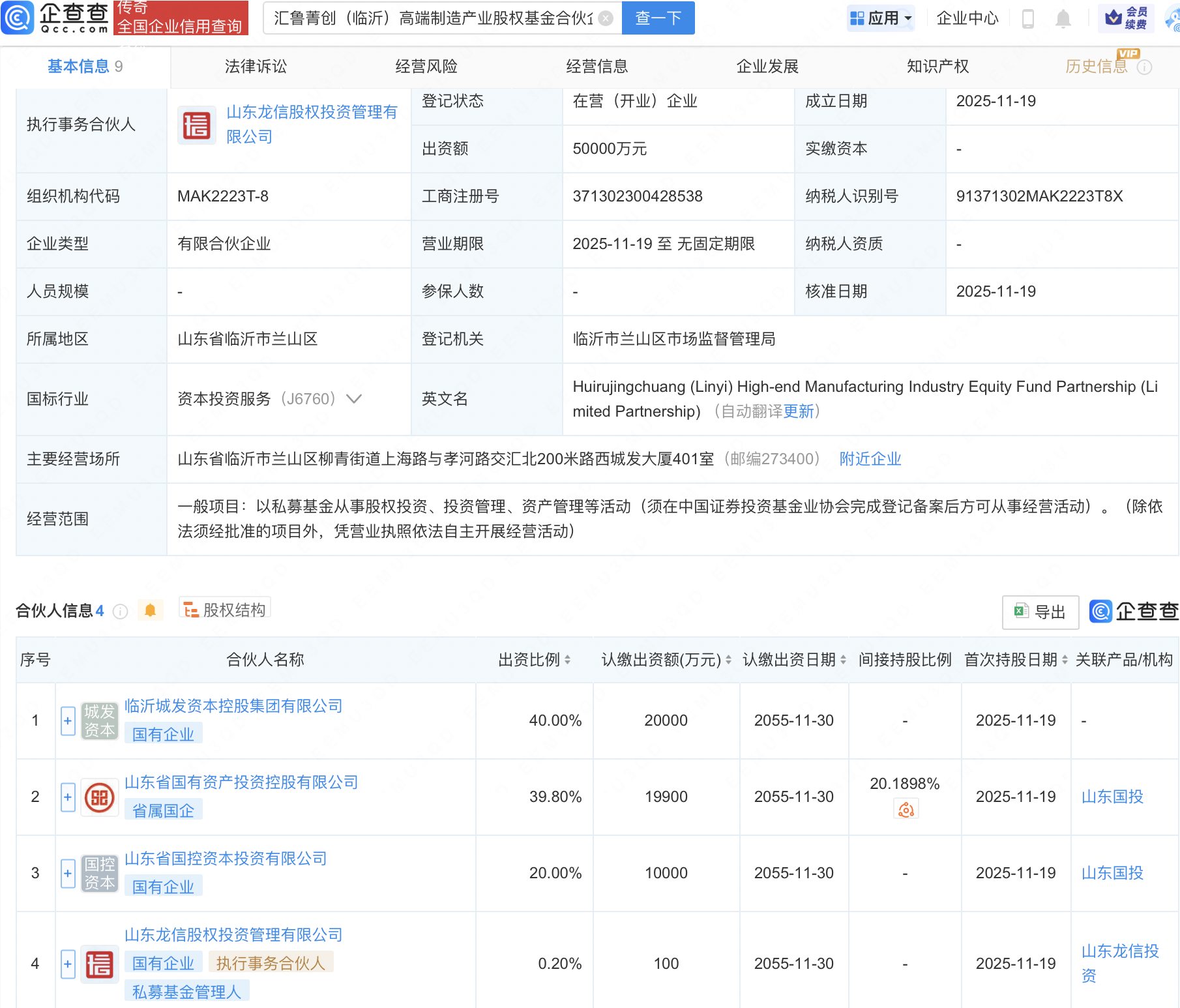 企查查APP显示,近日,汇鲁菁创(临沂)高端制造产业股权基金合伙企业(有限合伙)成立,出资额5亿元,经营范围包含:以私募基金从事股权投资、投资管理、资产管理等活动。企查查股权穿透显示,该企业由山东省国有资产投资控股有限公司、山东省国控资本投资有限公司等共同出资。