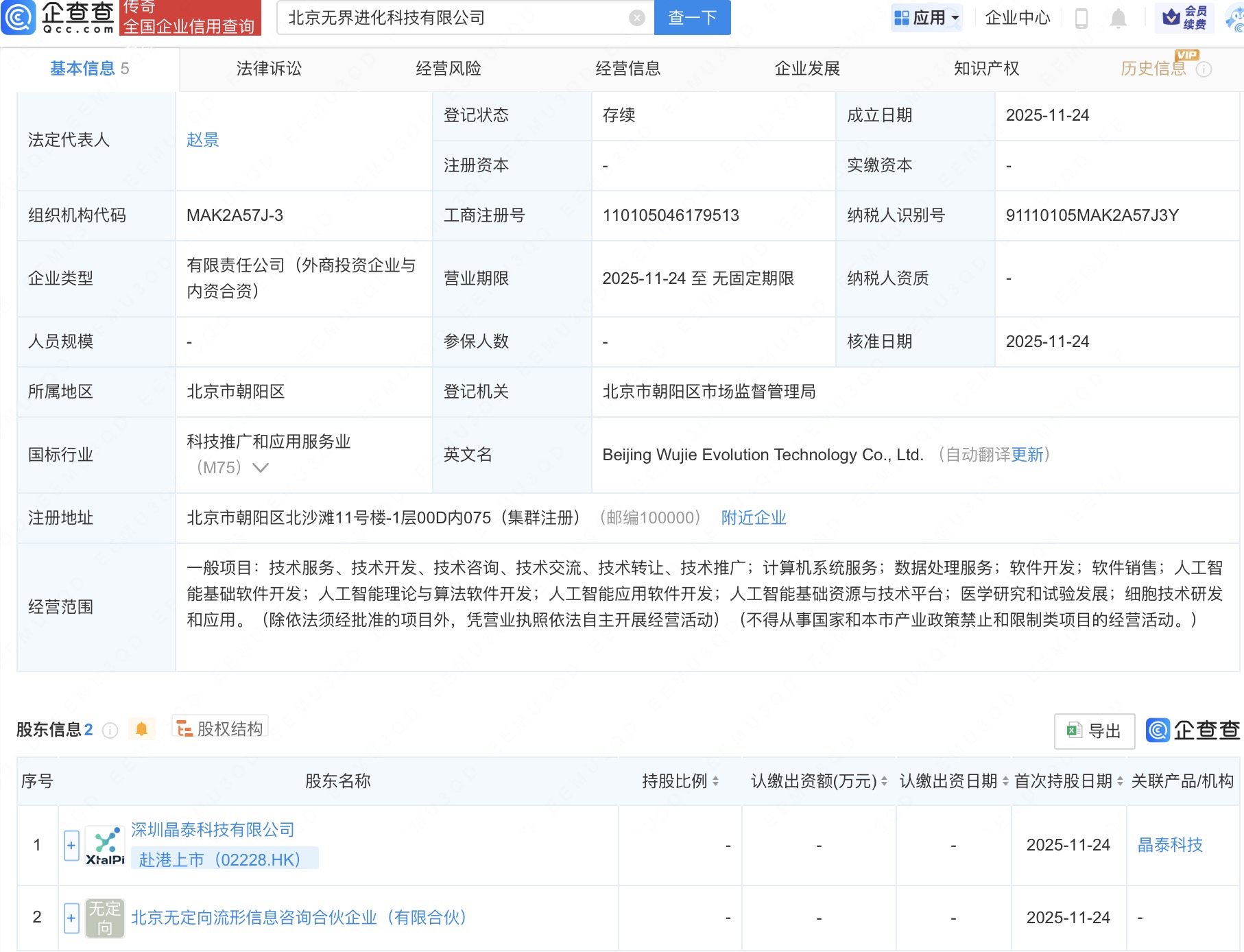 企查查APP显示,近日,北京无界进化科技有限公司成立,经营范围包含:人工智能基础软件开发;人工智能理论与算法软件开发;人工智能应用软件开发;人工智能基础资源与技术平台等。企查查股权穿透显示,该公司由晶泰控股关联公司深圳晶泰科技有限公司等共同持股。
