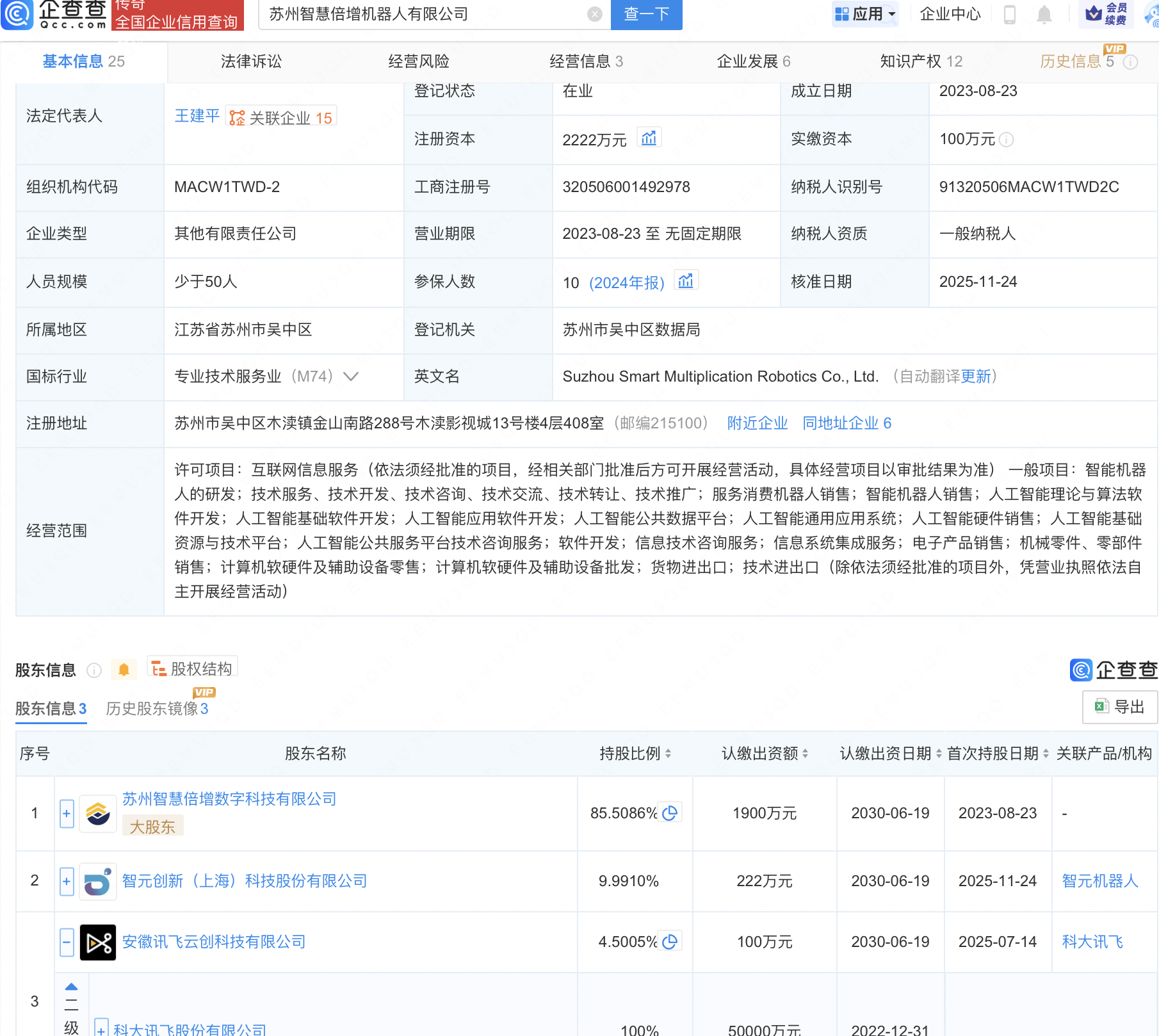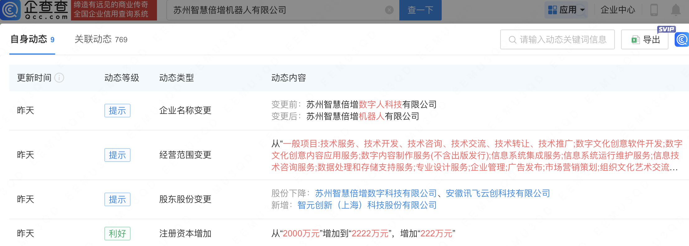 企查查APP显示,近日,原苏州智慧倍增数字人科技有限公司发生工商变更,企业名称变更为苏州智慧倍增机器人有限公司,新增智元机器人关联公司智元创新(上海)科技股份有限公司为股东。企查查信息显示,该公司成立于2023年,法定代表人为王建平,经营范围包含:人工智能公共数据平台;人工智能通用应用系统;人工智能硬件销售等,股东包含科大讯飞(002230)全资子公司安徽讯飞云创科技有限公司。