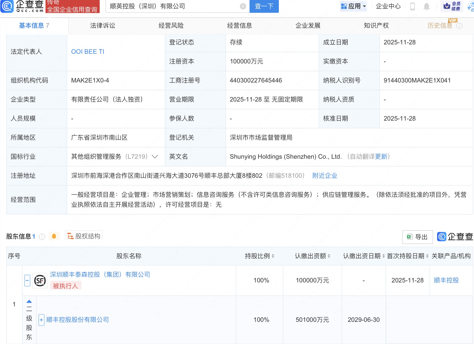 企查查APP显示,近日,顺英控股(深圳)有限公司成立,注册资本10亿元,经营范围包含:企业管理;市场营销策划;信息咨询服务(不含许可类信息咨询服务);供应链管理服务。企查查股权穿透显示,该公司由顺丰控股(002352)间接全资持股。