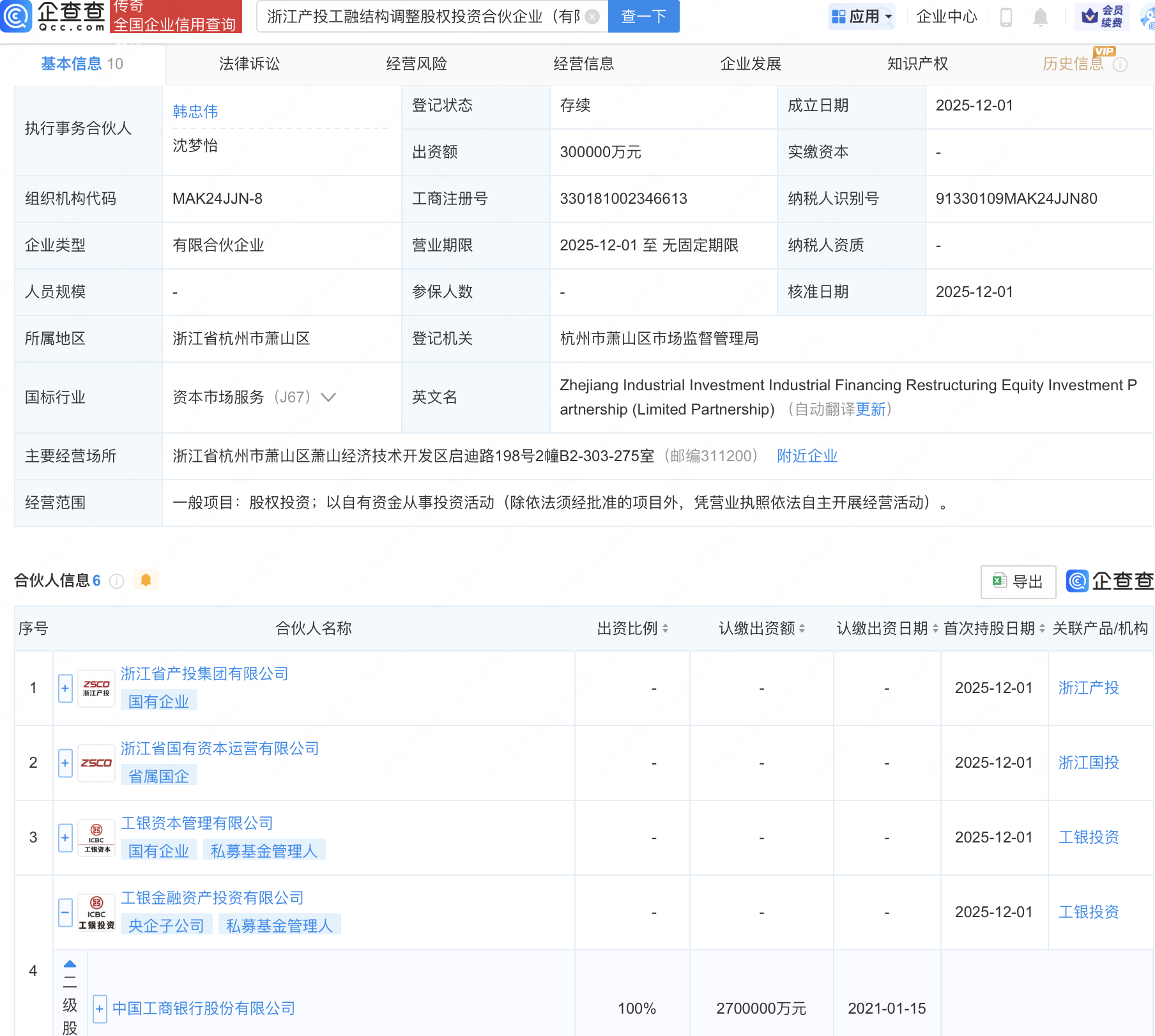 企查查APP显示,近日,浙江产投工融结构调整股权投资合伙企业(有限合伙)成立,出资额30亿元,经营范围包含:股权投资;以自有资金从事投资活动。企查查股权穿透显示,该企业由浙江省国有资本运营有限公司、工商银行(601398)全资子公司工银金融资产投资有限公司等共同出资。