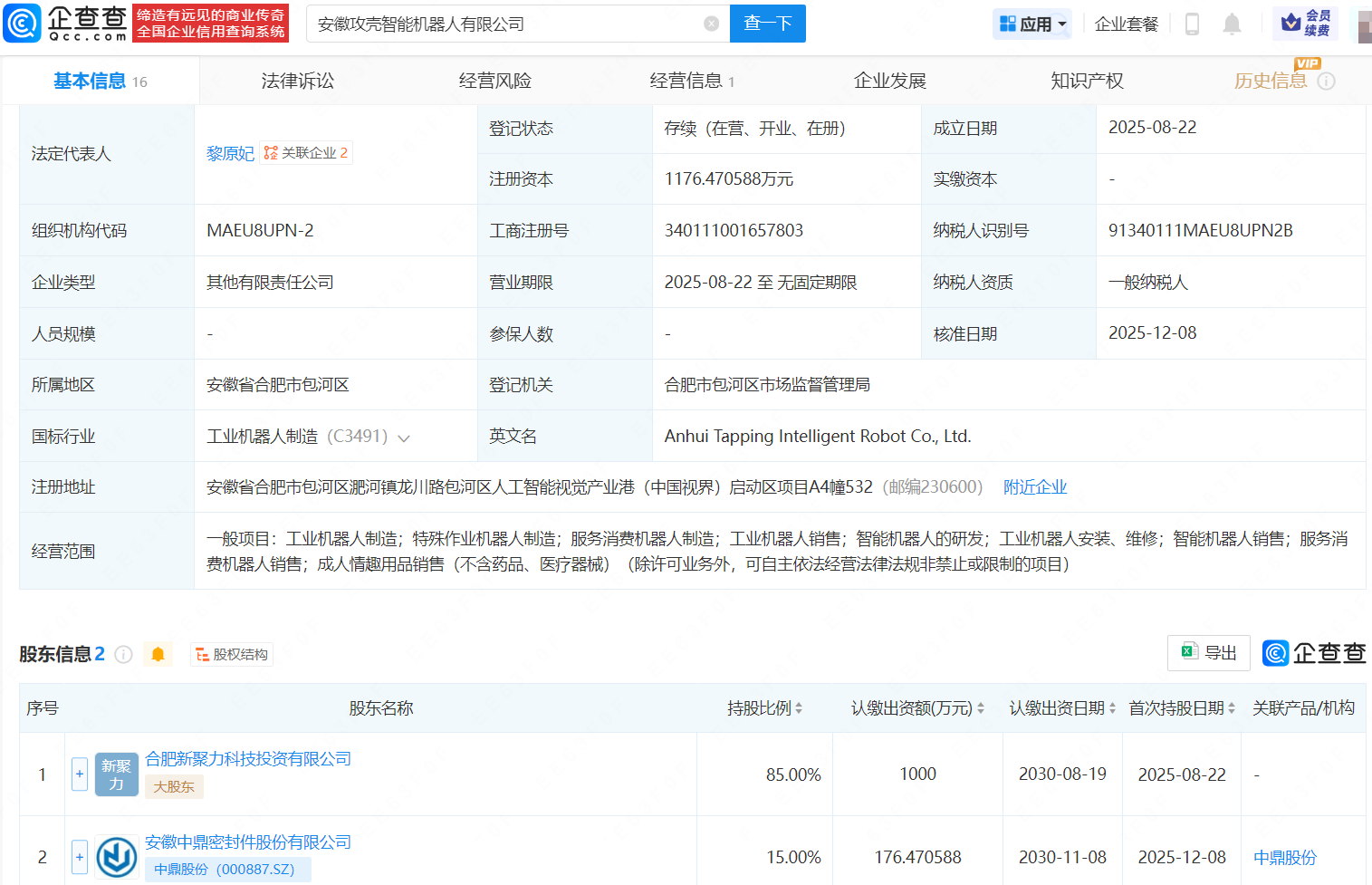 企查查APP显示,近日,安徽攻壳智能机器人有限公司发生工商变更,新增中鼎股份(000887)为股东,注册资本由1000万元增至约1176万元,增幅约17.65%。企查查信息显示,该公司成立于2025年8月,法定代表人为黎原妃,经营范围包含工业机器人制造、特殊作业机器人制造、服务消费机器人制造等,现由合肥新聚力科技投资有限公司、中鼎股份(000887)共同持股。