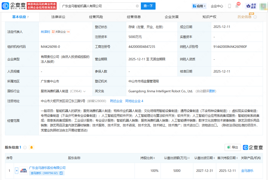 企查查APP显示,近日,广东金马智能机器人有限公司成立,法定代表人为林泽钊,注册资本5000万人民币,经营范围涉及智能机器人的研发、服务消费机器人制造、特殊作业机器人制造、文化场馆用智能设备制造等。企查查股权穿透显示,该公司由金马游乐(300756)全资持股。