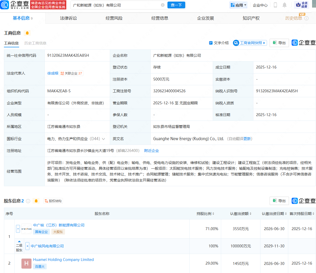 企查查APP显示,近日,广和新能源(如东)有限公司成立,法定代表人为徐成根,注册资本为5000万元,经营范围包含:发电业务、输电业务、供(配)电业务;风力发电技术服务;充电桩销售;储能技术服务等。企查查股权穿透显示,该公司由中广核风电有限公司全资子公司中广核(江苏)新能源有限公司、Huamei Holding Company Limited共同持股。