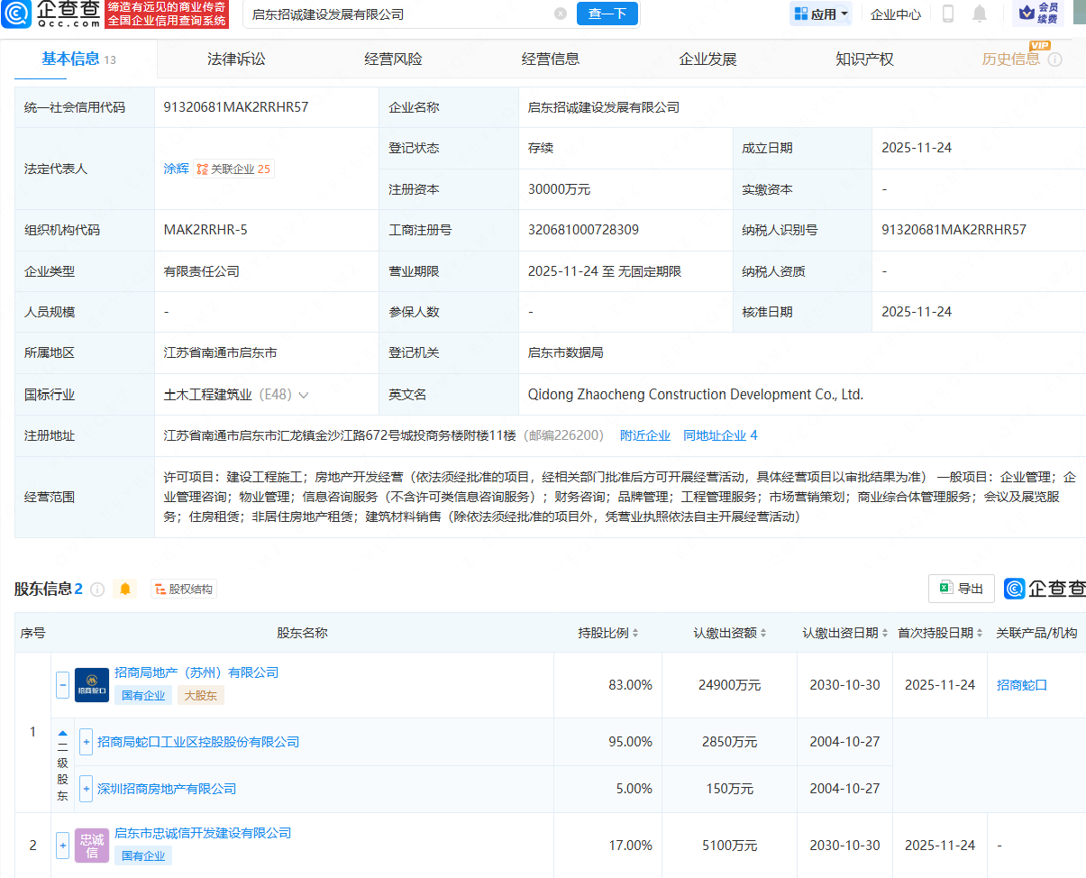 企查查APP显示,近日,启东招诚建设发展有限公司成立,法定代表人为涂辉,注册资本为3亿元,经营范围包含:建设工程施工;房地产开发经营;物业管理;商业综合体管理服务;住房租赁;非居住房地产租赁等。企查查股权穿透显示,该公司由招商蛇口(001979)旗下招商局地产(苏州)有限公司、启东市忠诚信开发建设有限公司共同持股。