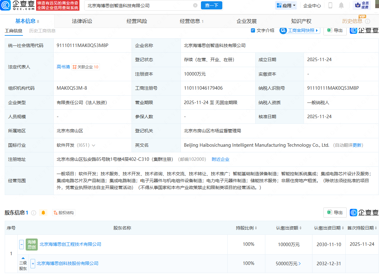 企查查APP显示,近日,北京海博思创智造科技有限公司成立,法定代表人为高书清,注册资本为1亿元,经营范围包含:智能基础制造装备制造;集成电路芯片设计及服务;集成电路芯片及产品制造;集成电路制造等。企查查股权穿透显示,该公司由海博思创(688411)间接全资持股。