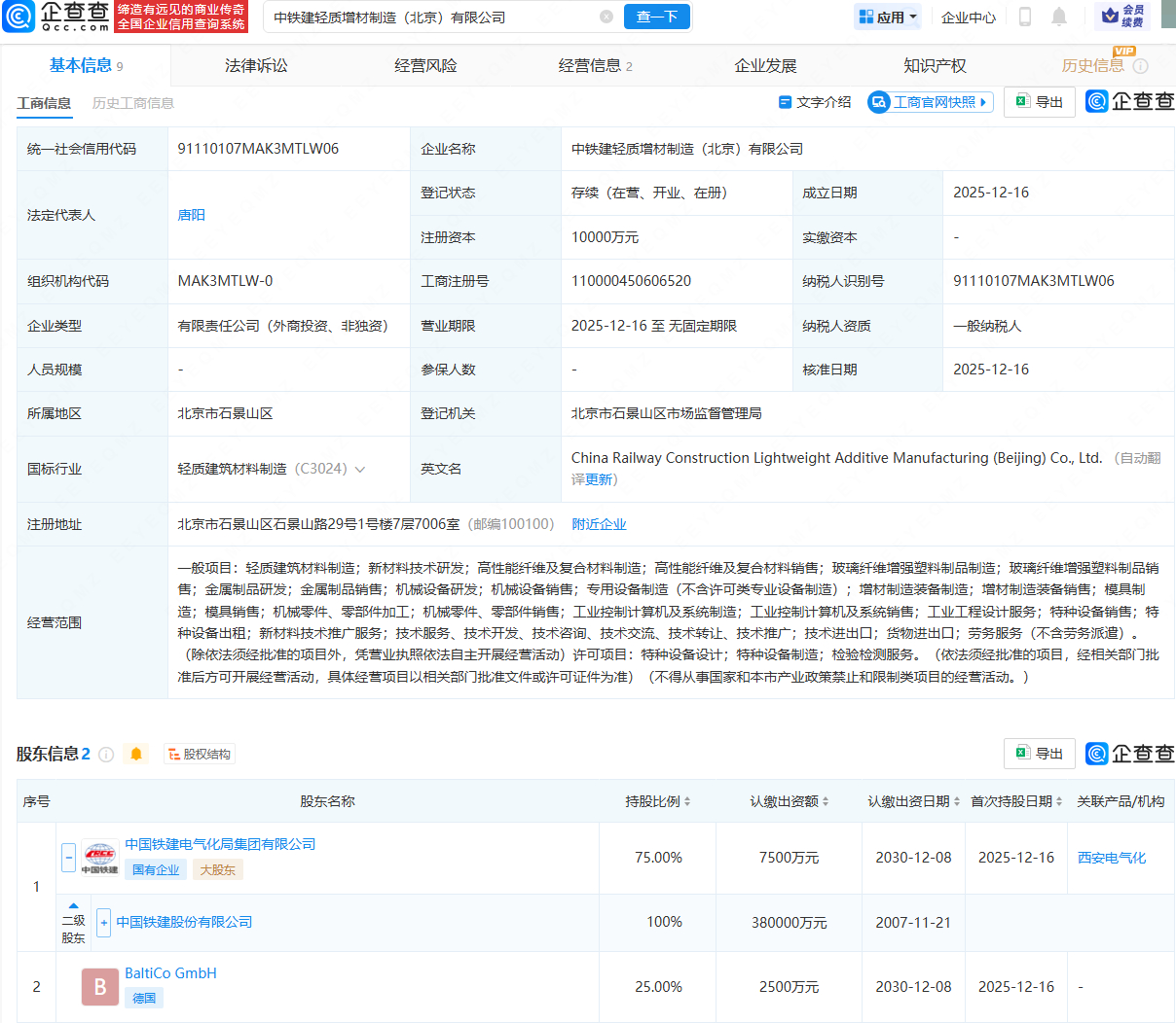 企查查APP显示,近日,中铁建轻质增材制造(北京)有限公司成立,法定代表人为唐阳,注册资本为1亿元,经营范围包含:轻质建筑材料制造;新材料技术研发;高性能纤维及复合材料制造;高性能纤维及复合材料销售等。企查查股权穿透显示,该公司由中国铁建(601186)全资子公司中国铁建电气化局集团有限公司、BaltiCo GmbH共同持股。