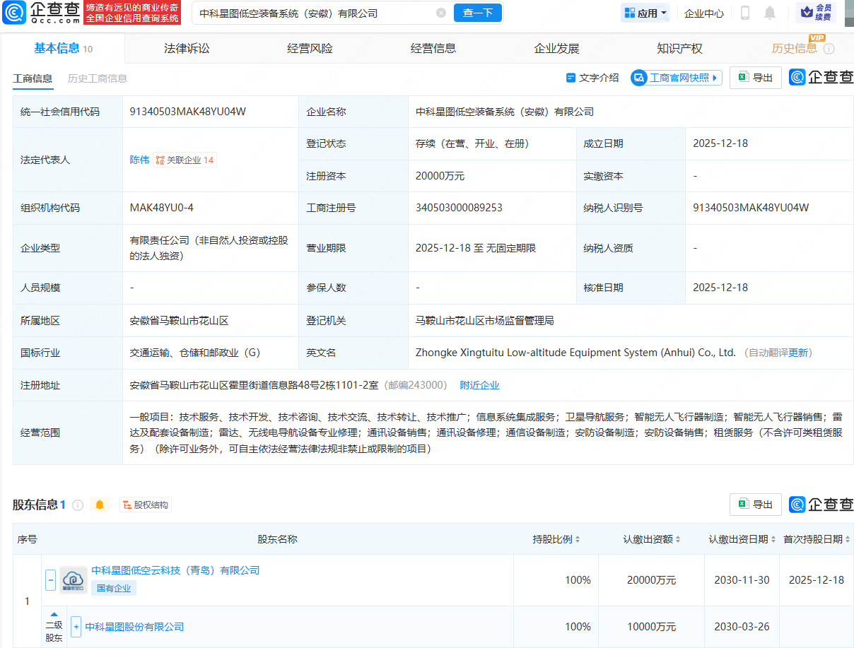 企查查APP显示,近日,中科星图低空装备系统(安徽)有限公司成立,法定代表人为陈伟,注册资本为2亿元,经营范围包含:卫星导航服务;智能无人飞行器制造;智能无人飞行器销售;雷达及配套设备制造等。企查查股权穿透显示,该公司由中科星图(688568)间接全资持股。