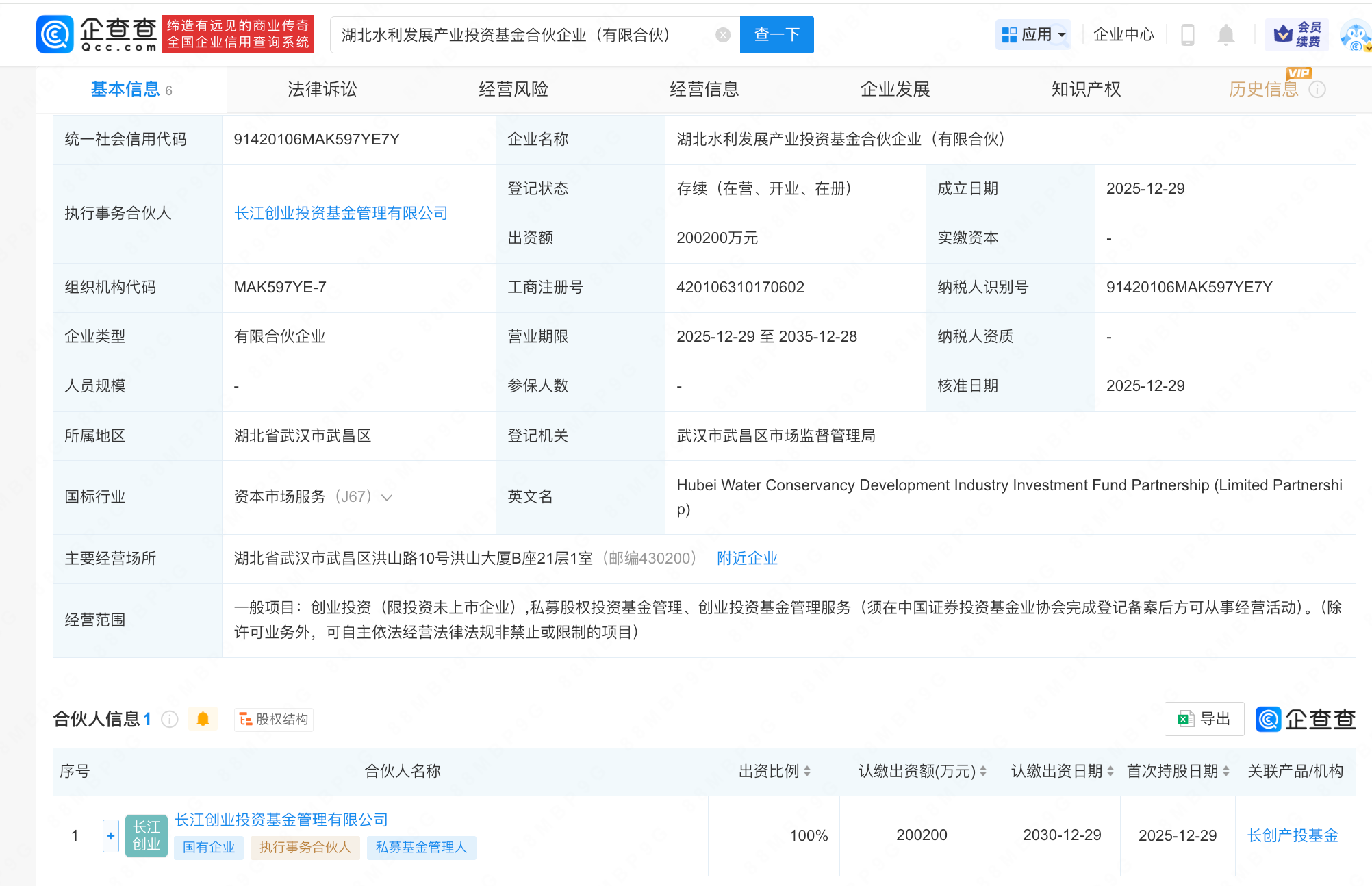 企查查APP显示,近日,湖北水利发展产业投资基金合伙企业(有限合伙)成立,执行事务合伙人为长江创业投资基金管理有限公司,出资额约20亿人民币,经营范围为创业投资,私募股权投资基金管理、创业投资基金管理服务。企查查股权穿透显示,该基金由长江创业投资基金管理有限公司全资持股。