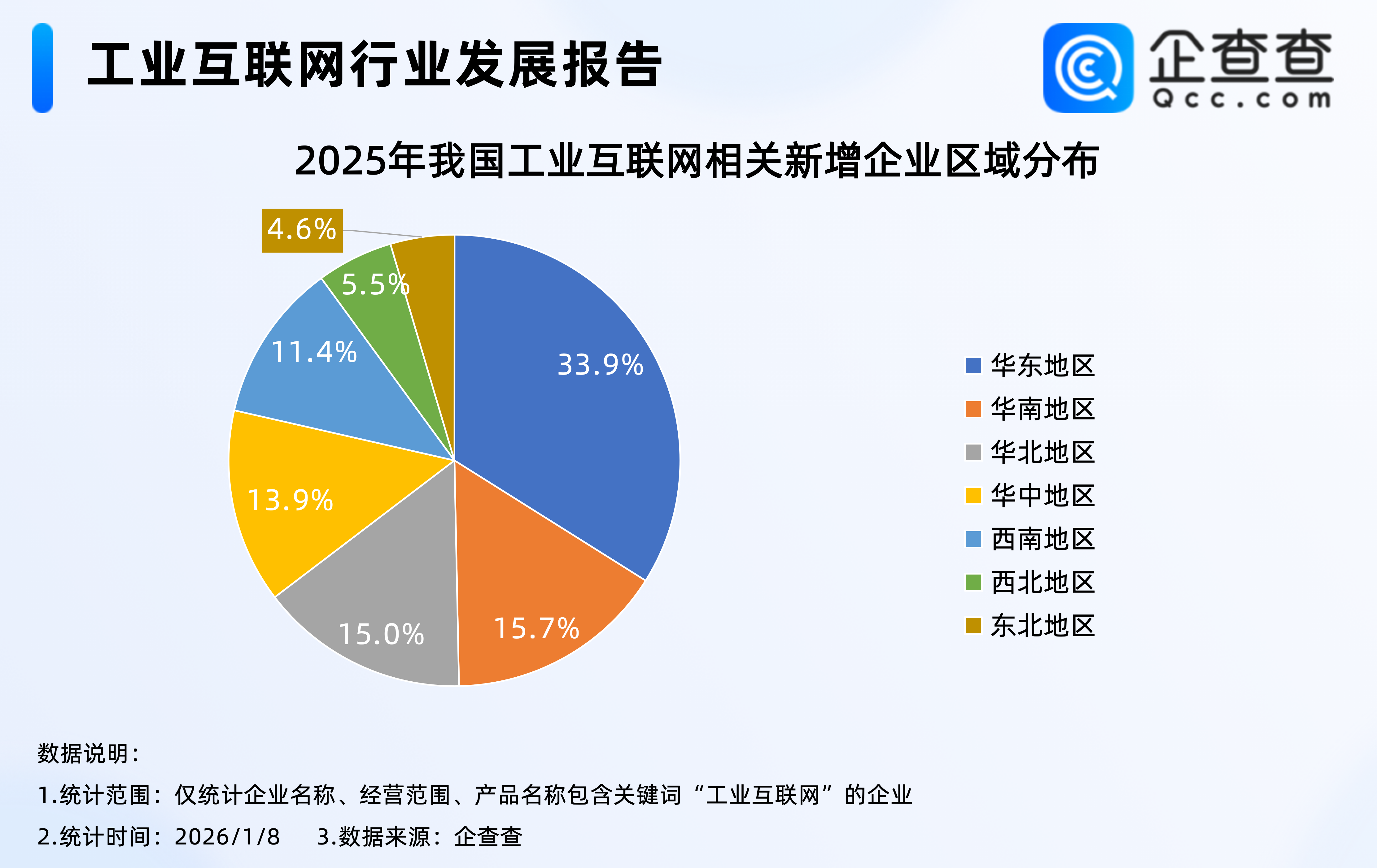 企查查数据显示,2025年新注册的15.6万家工业互联网相关企业中,位于华东地区的相关企业最多,占比33.9%,其次是华南地区,占比15.7%,西北、东北地区相对最少,分占5.5%、4.6%。