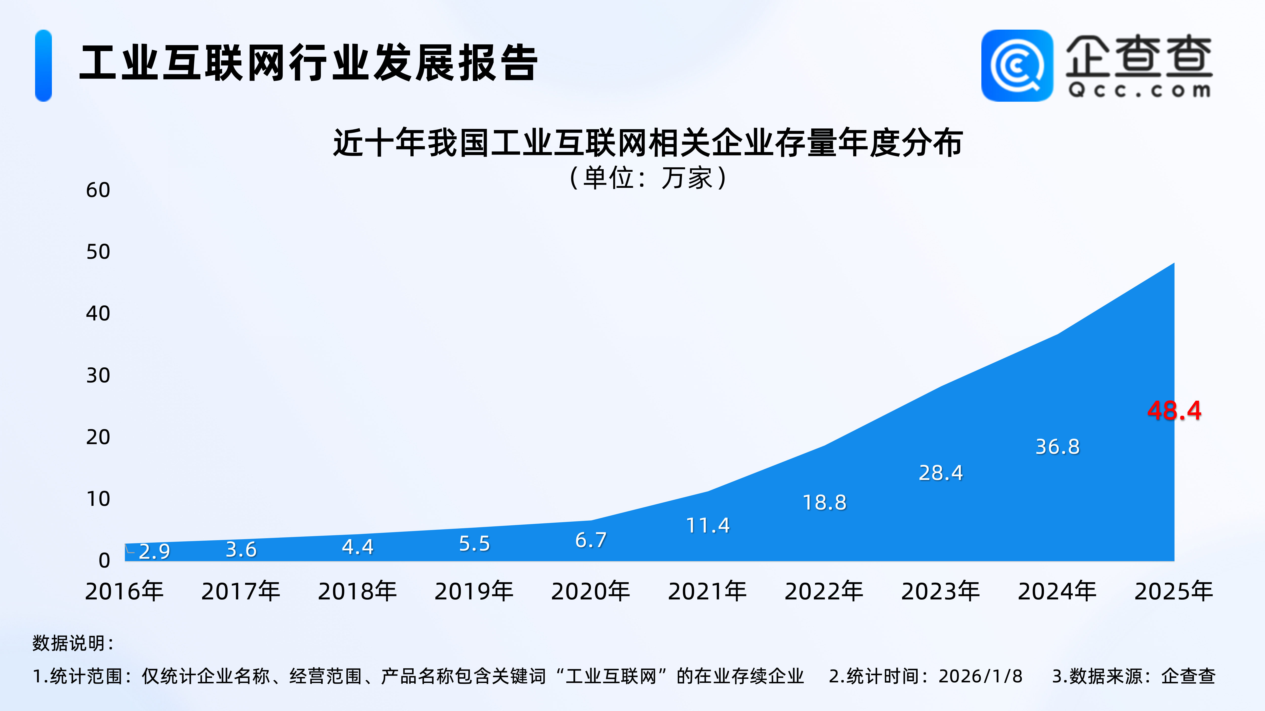 企查查数据显示,近十年,我国工业互联网相关企业存量逐年增加,并于2021年开始增速加快,截至2025年年底,我国现存48.4万家工业互联网相关企业。