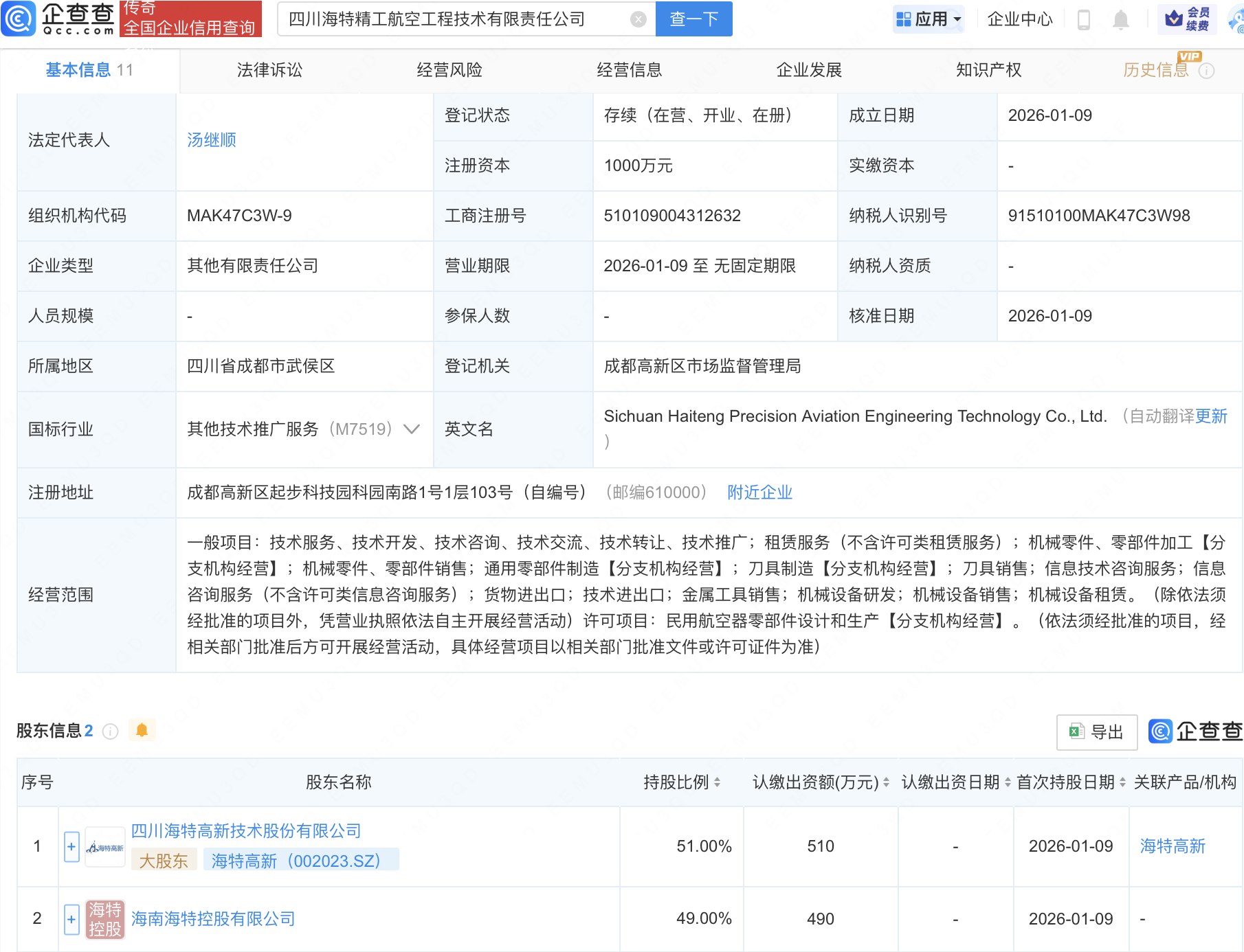 企查查APP显示,近日,四川海特精工航空工程技术有限责任公司成立,注册资本1000万元,经营范围包含:货物进出口;技术进出口;金属工具销售;机械设备研发;机械设备销售等。企查查股权穿透显示,该公司由海特高新(002023)等共同持股。