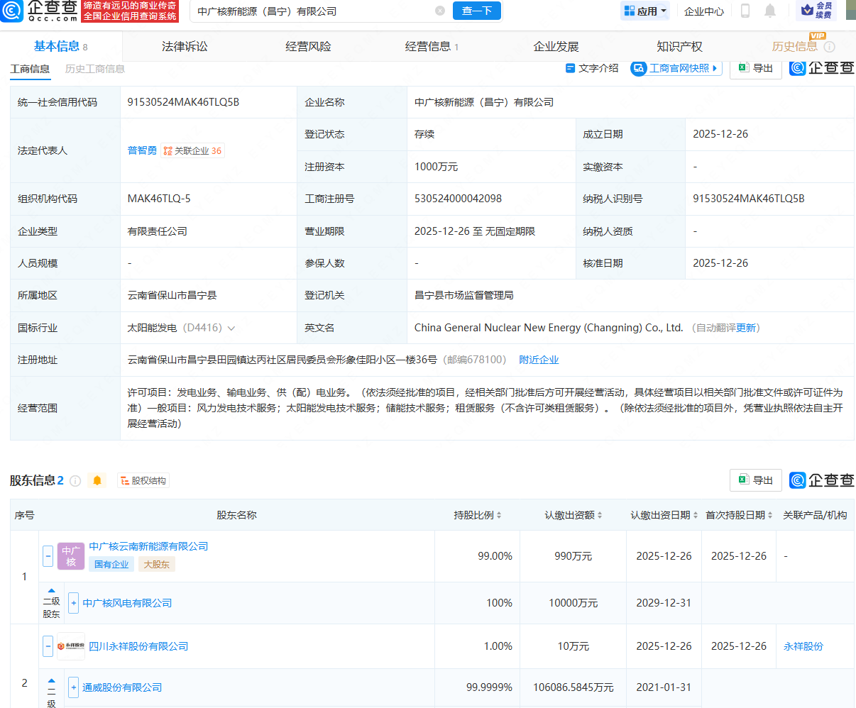 企查查APP显示,近日,中广核新能源(昌宁)有限公司成立,法定代表人为普智勇,注册资本为1000万元,经营范围包含:发电业务、输电业务、供(配)电业务;太阳能发电技术服务;储能技术服务等。企查查股权穿透显示,该公司由中广核风电有限公司旗下中广核云南新能源有限公司、通威股份(600438)旗下四川永祥股份有限公司共同持股。