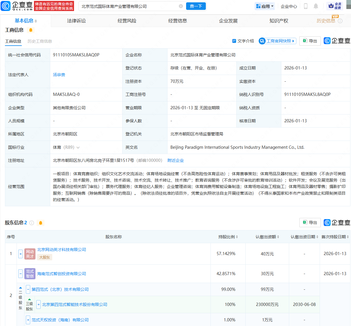 企查查APP显示,近日,北京范式国际体育产业管理有限公司成立,法定代表人为汤宗贵,经营范围包含:体育竞赛组织;组织文化艺术交流活动;体育赛事策划;体育用品及器材批发等。企查查股权穿透显示,该公司由北京网动英才科技有限公司、第四范式(06682.HK)旗下海南范式智创投资有限公司共同持股。