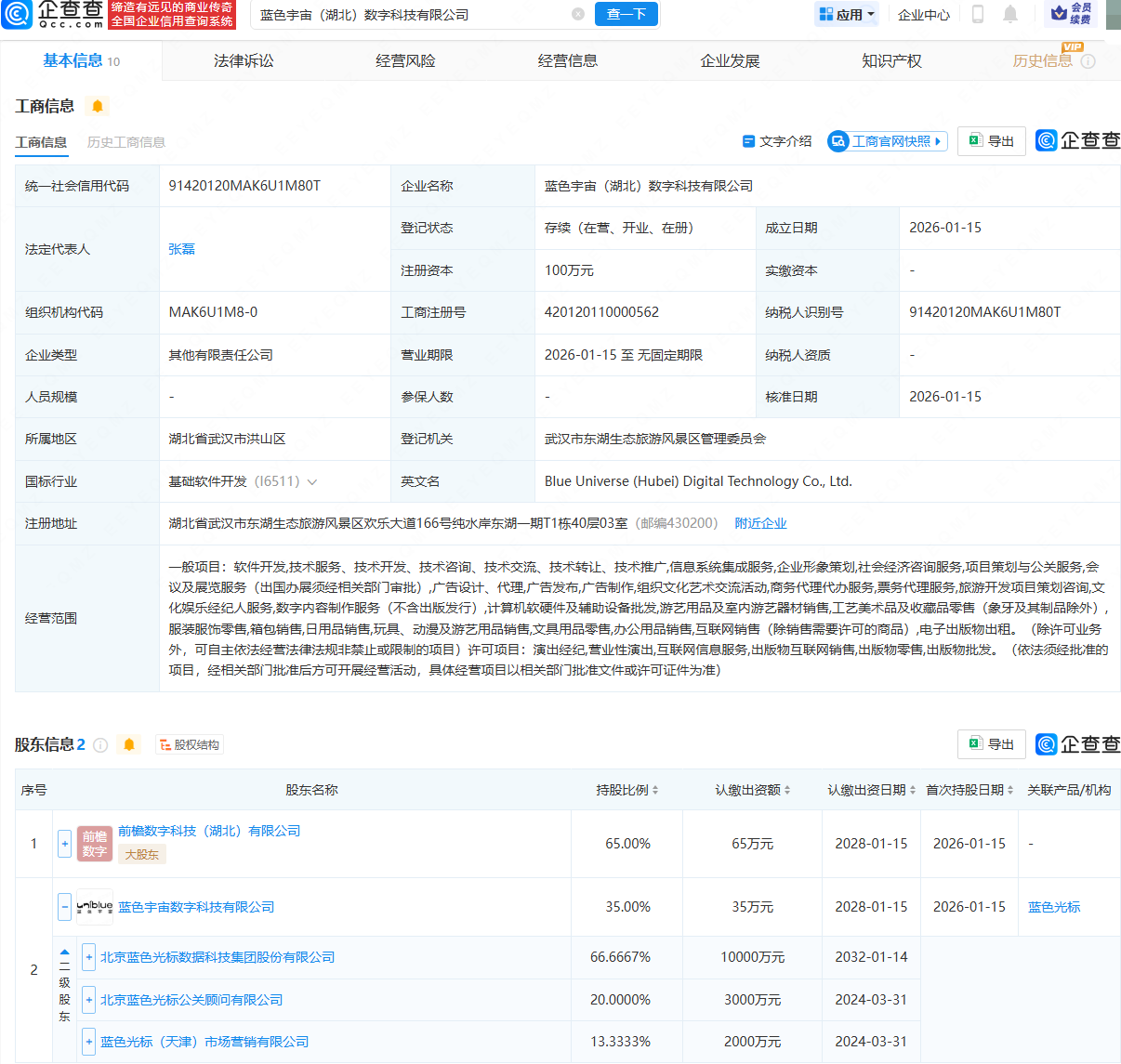企查查APP显示,近日,蓝色宇宙(湖北)数字科技有限公司成立,法定代表人为张磊,经营范围包含:信息系统集成服务;企业形象策划;社会经济咨询服务;服装服饰零售;箱包销售;演出经纪等。企查查股权穿透显示,该公司由前檐数字科技(湖北)有限公司、蓝色光标(300058)旗下蓝色宇宙数字科技有限公司共同持股。