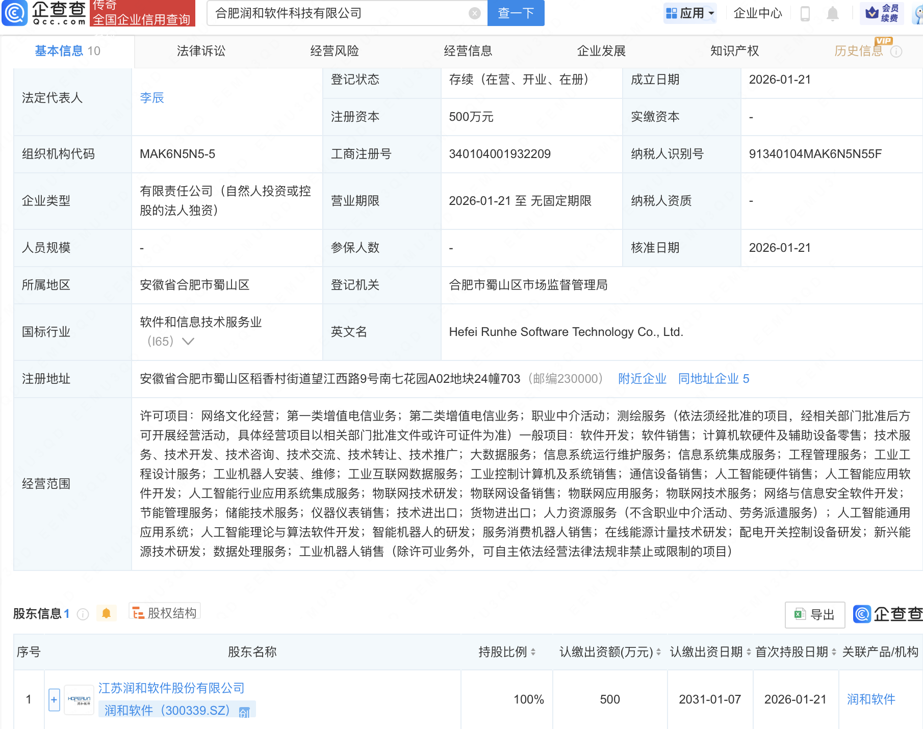 企查查APP显示,近日,合肥润和软件科技有限公司成立,经营范围包含:人工智能通用应用系统;人工智能理论与算法软件开发;智能机器人的研发;服务消费机器人销售;在线能源计量技术研发等。企查查股权穿透显示,该公司由润和软件(300339)全资持股。