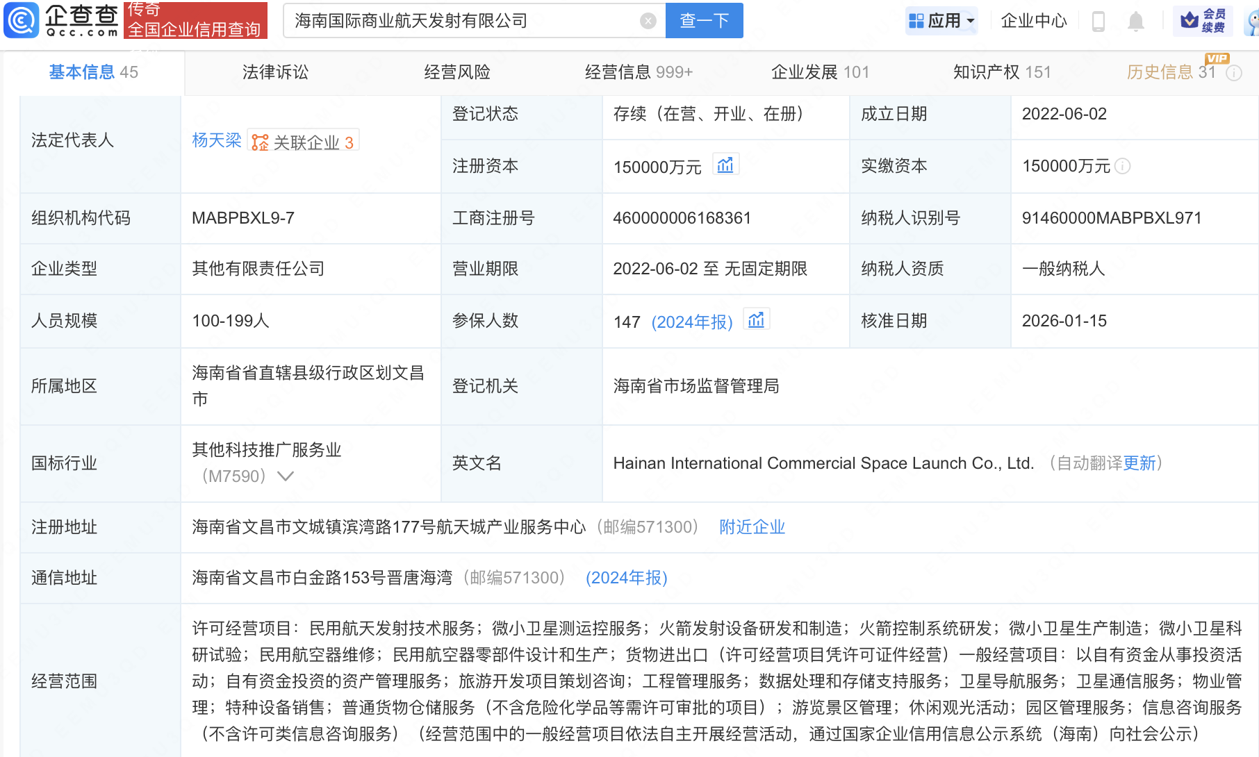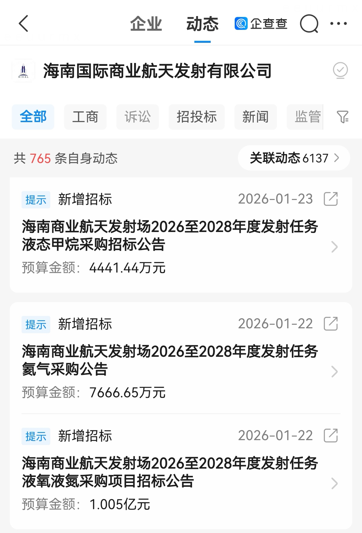 企查查APP显示,海南国际商业航天发射有限公司新增多项招标公告,招标项目为海南商业航天发射场2026至2028年度发射任务液态甲烷、氦气、液氧液氮采购,合计预算金额约2.2亿元。企查查信息显示,该公司成立于2022年,注册资本15亿元,经营范围包含:民用航天发射技术服务;微小卫星测运控服务;火箭发射设备研发和制造等。1月19日,在海南商业航天发射场,长征十二号运载火箭成功将卫星互联网低轨19组卫星送入预定轨道。