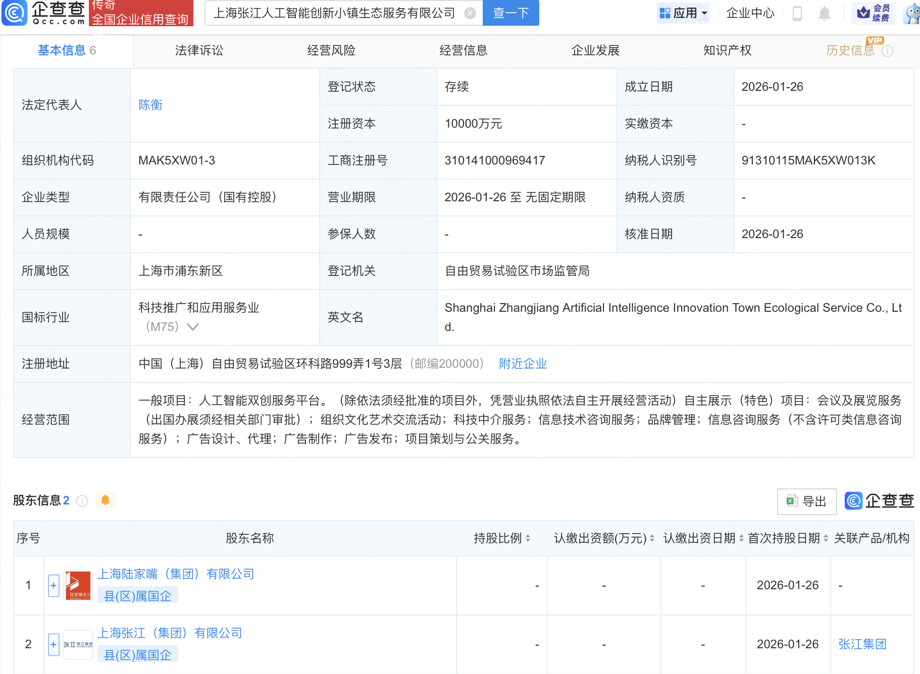张江集团、陆家嘴集团成立AI创新小镇生态服务公司