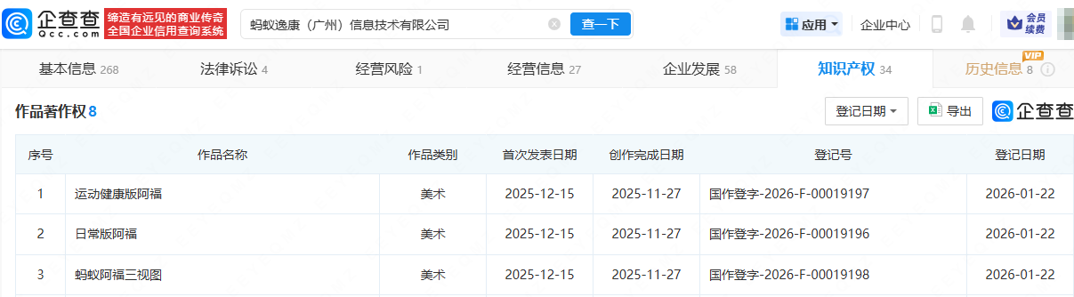 企查查APP显示,近日,蚂蚁集团旗下蚂蚁逸康(广州)信息技术有限公司登记“日常版阿福”“蚂蚁阿福三视图”“运动健康版阿福”作品著作权,作品类别均为美术。