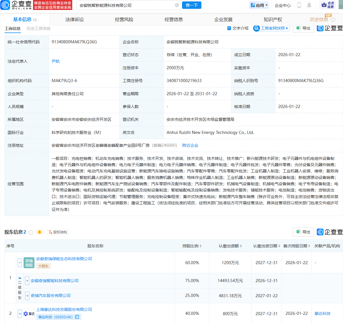 企查查APP显示,近日,安徽锐智新能源科技有限公司成立,法定代表人为尹航,注册资本为2000万元,经营范围包含:充电桩销售;机动车充电销售;电力电子元器件制造;工业机器人制造;智能机器人的研发等。企查查股权穿透显示,该公司由奇瑞旗下安徽奇瑞绿能生态科技有限公司、挚达科技(02650.HK)共同持股。