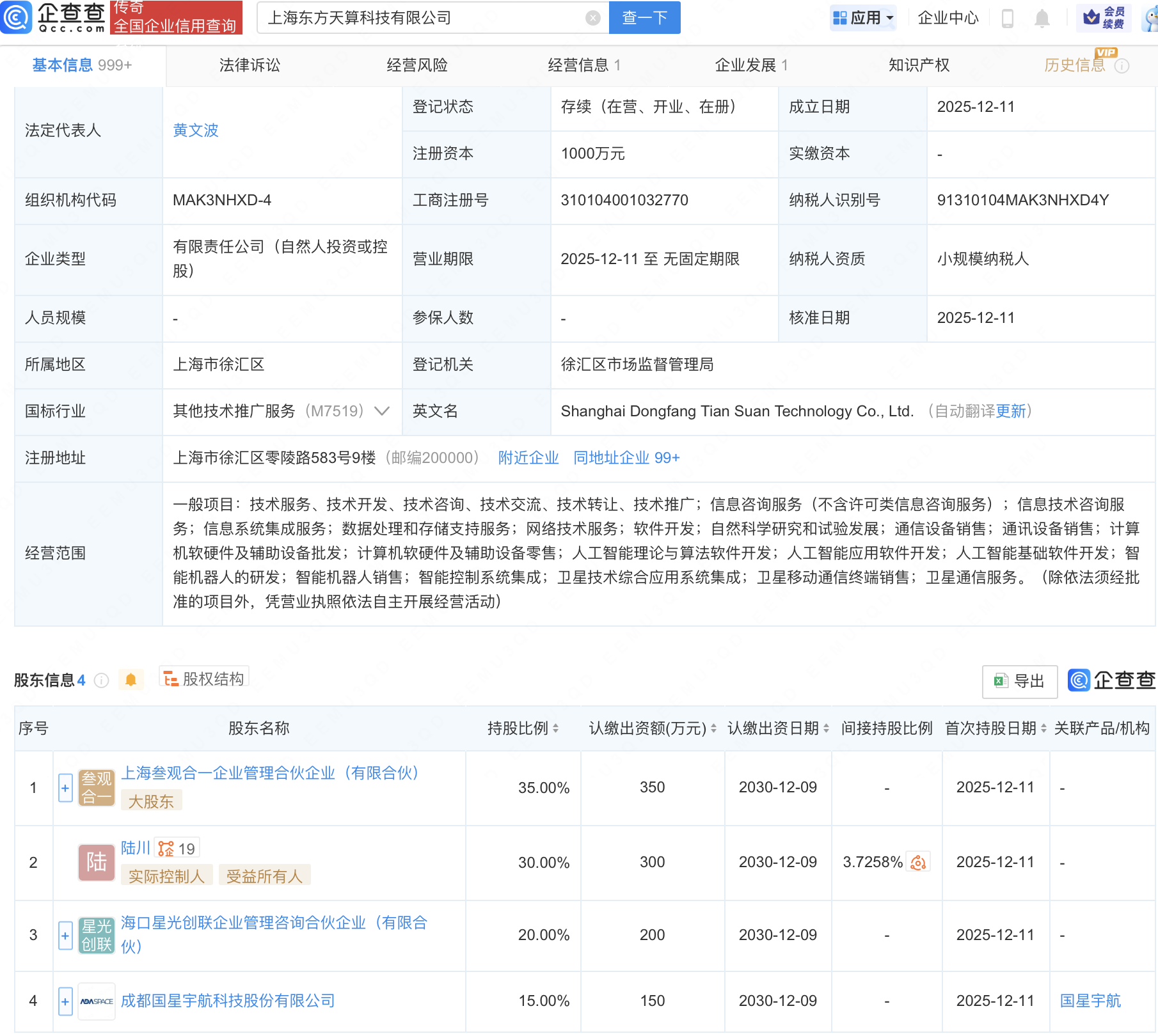企查查APP显示,上海东方天算科技有限公司成立,注册资本1000万元,经营范围包含:人工智能应用软件开发;人工智能基础软件开发;智能机器人的研发;卫星技术综合应用系统集成;卫星移动通信终端销售;卫星通信服务等。企查查股权穿透显示,该公司由成都国星宇航科技股份有限公司等共同持股。