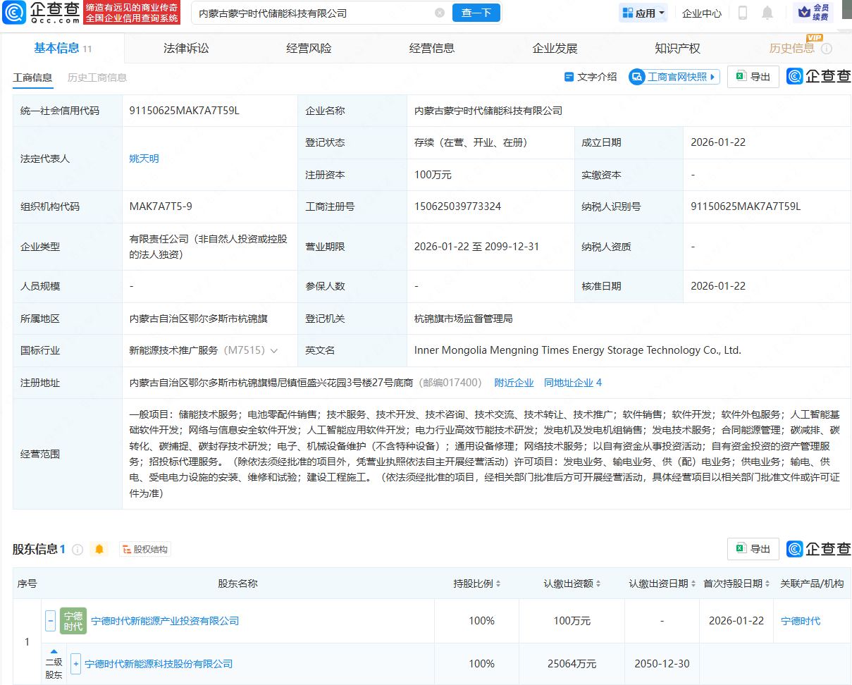 企查查APP显示,近日,内蒙古蒙宁时代储能科技有限公司成立,法定代表人为姚天明,经营范围包含:储能技术服务;电池零配件销售;人工智能基础软件开发;网络与信息安全软件开发;人工智能应用软件开发等。企查查股权穿透显示,该公司由宁德时代(300750)间接全资持股。
