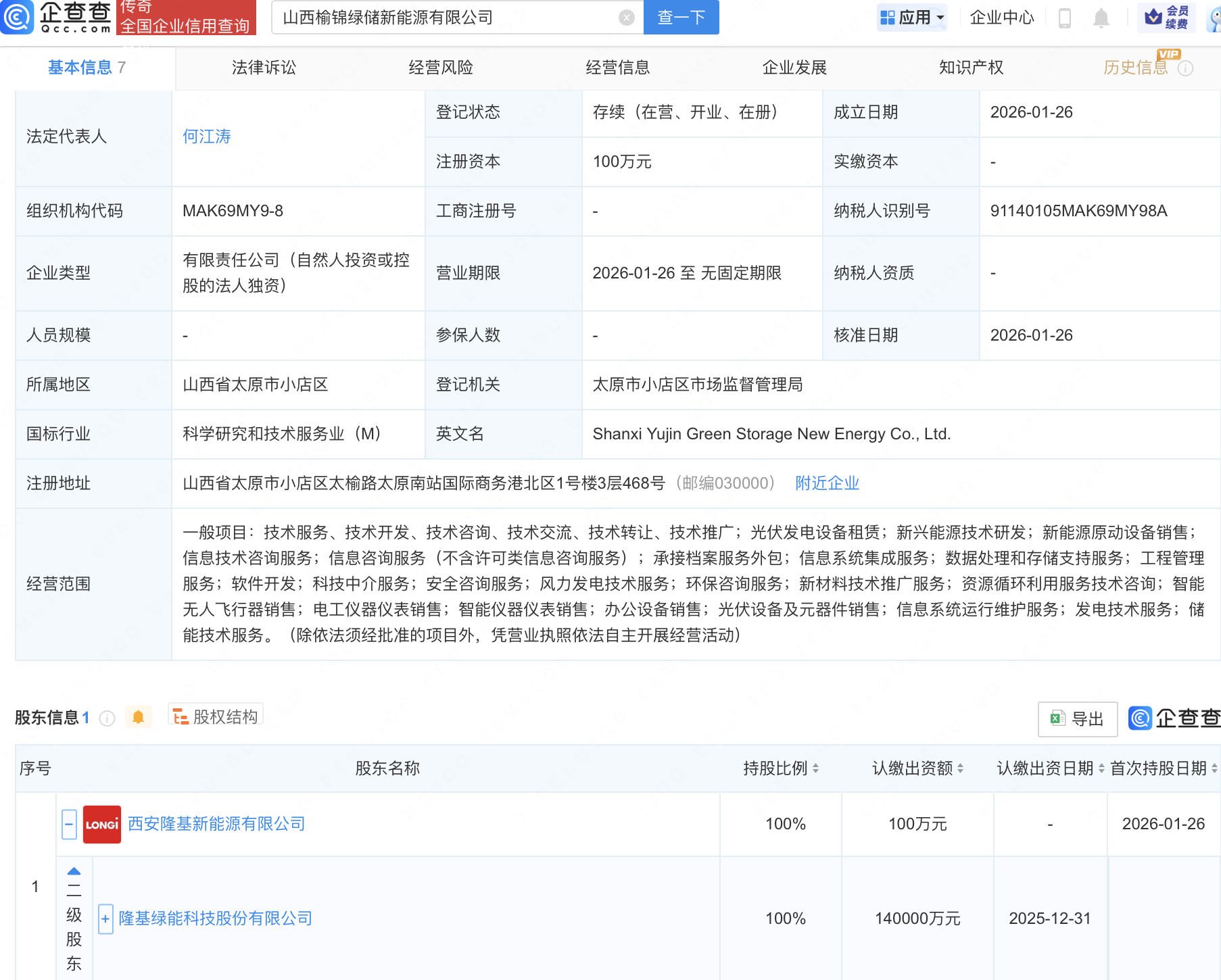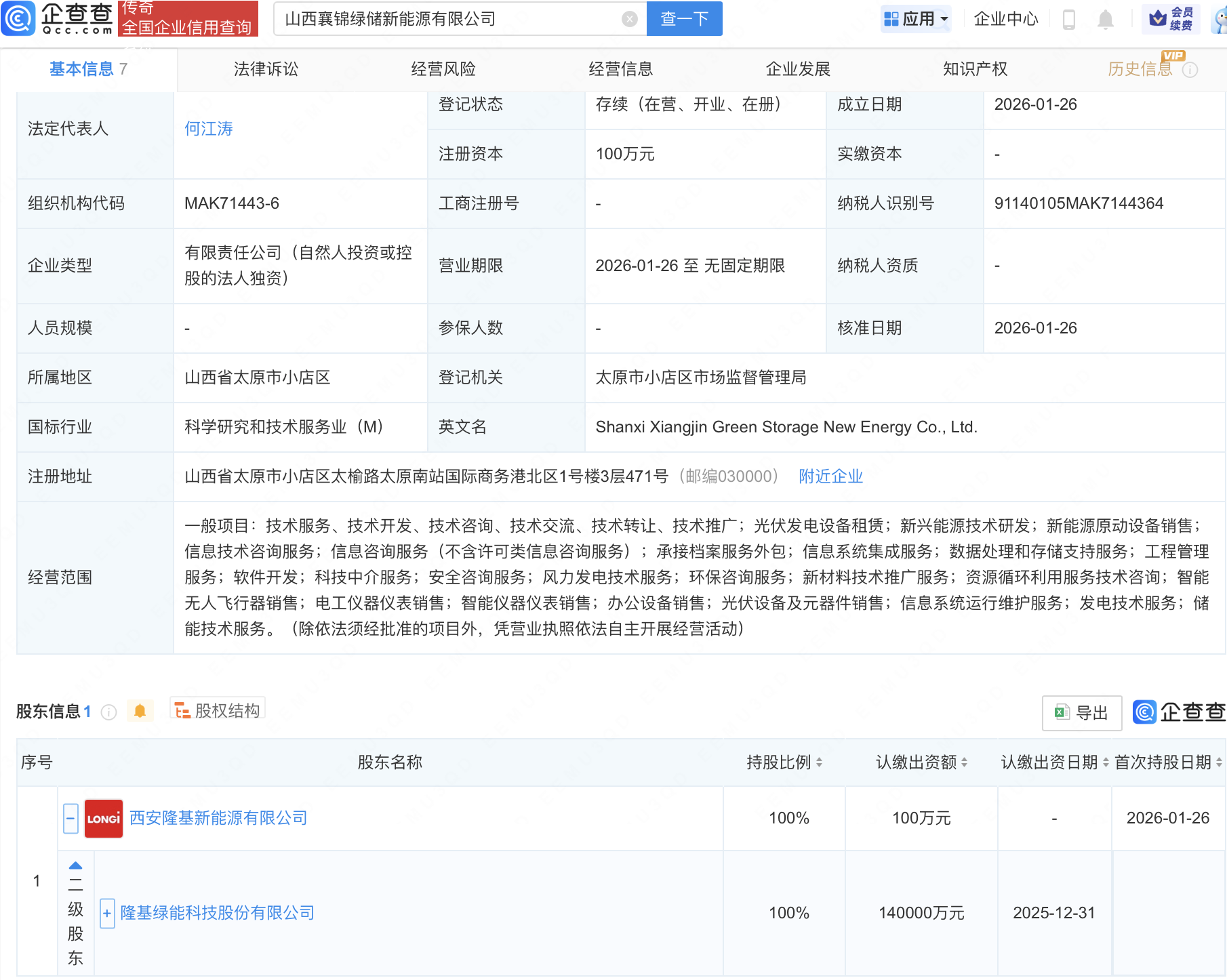 企查查APP显示,近日,山西榆锦绿储新能源有限公司、山西襄锦绿储新能源有限公司成立,法定代表人同为何江涛,经营范围均包含:新材料技术推广服务;资源循环利用服务技术咨询;智能无人飞行器销售等。企查查股权穿透显示,二者皆由隆基绿能(601012)间接全资持股。