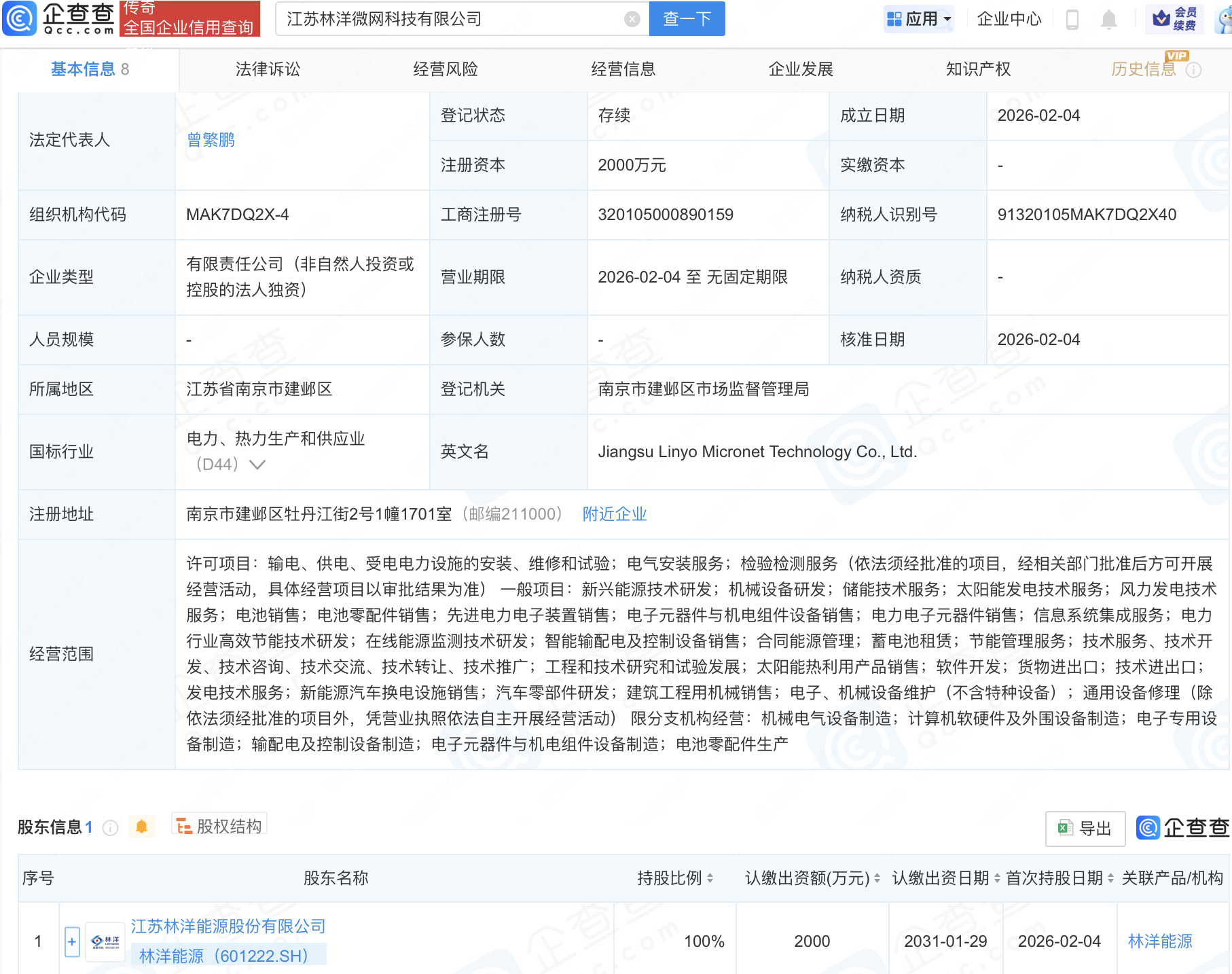 企查查APP显示,近日,江苏林洋微网科技有限公司成立,注册资本2000万元,经营范围包含:发电技术服务;新能源汽车换电设施销售;汽车零部件研发;建筑工程用机械销售等。企查查股权穿透显示,该公司由林洋能源(601222)全资持股。