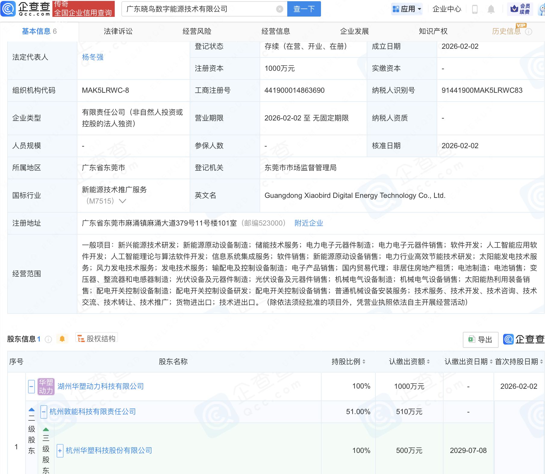 企查查APP显示,近日,广东晓鸟数字能源技术有限公司成立,注册资本1000万元,经营范围包含:人工智能应用软件开发;人工智能理论与算法软件开发;信息系统集成服务;软件销售等。企查查股权穿透显示,该公司由华塑科技(301157)旗下湖州华塑动力科技有限公司全资持股。