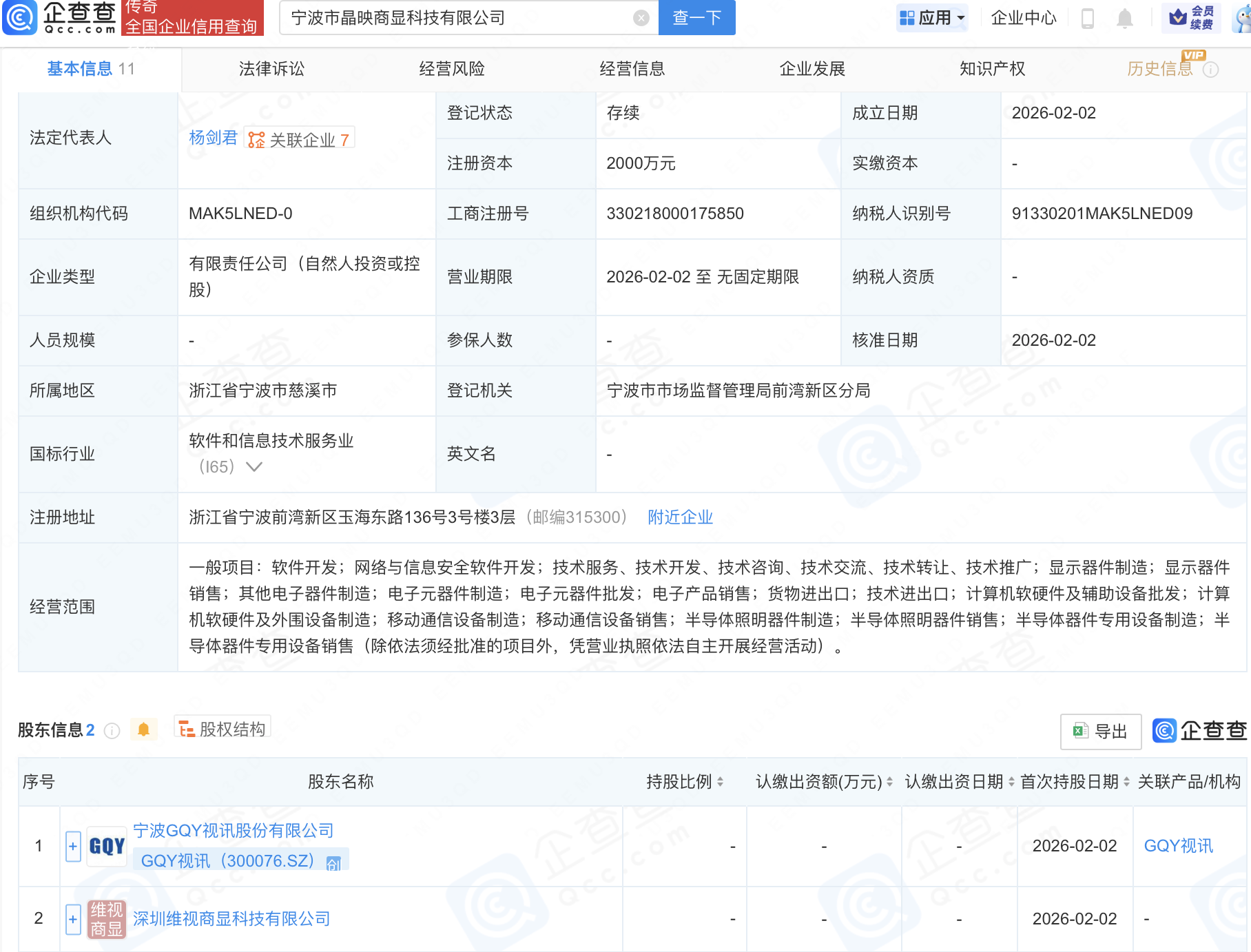 企查查APP显示,近日,宁波市晶映商显科技有限公司成立,注册资本2000万元,经营范围包含:半导体照明器件制造;半导体照明器件销售;半导体器件专用设备制造;半导体器件专用设备销售等。企查查股权穿透显示,该公司由GQY视讯(300076)等共同持股。
